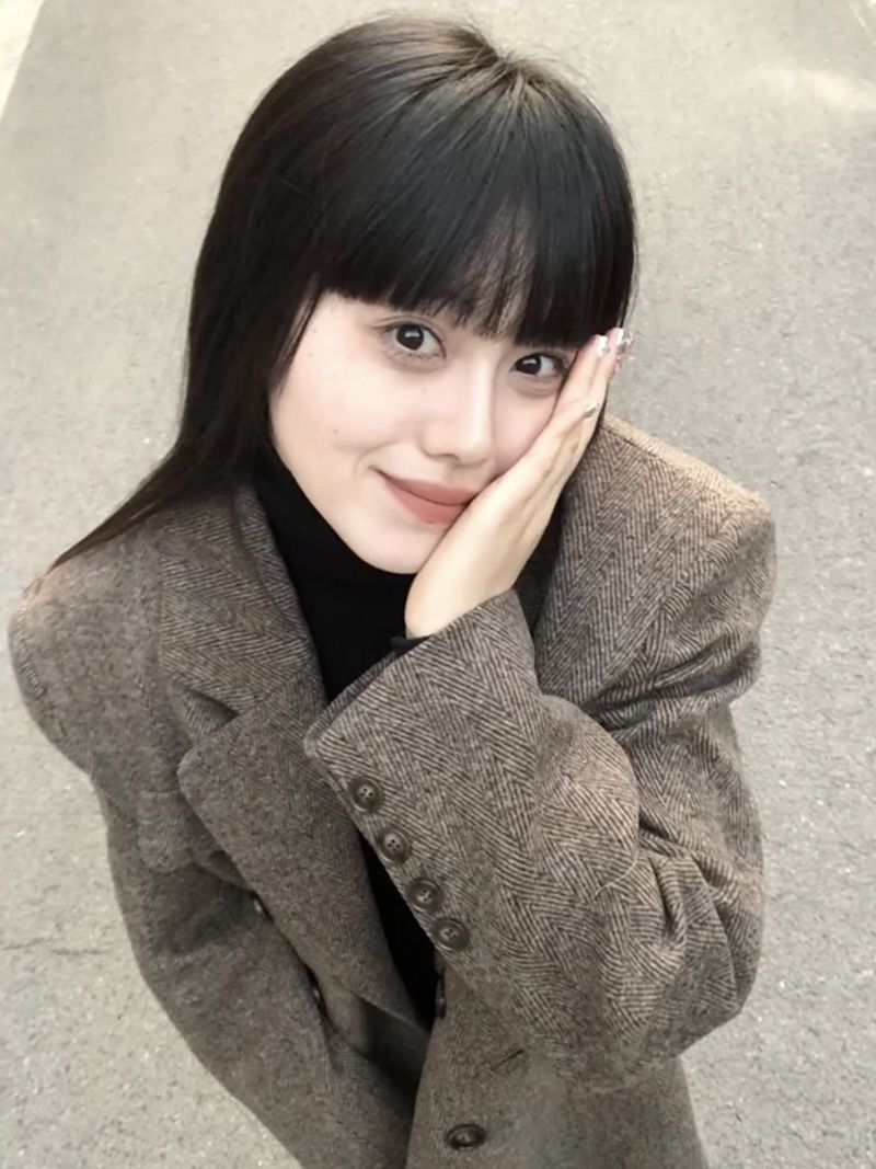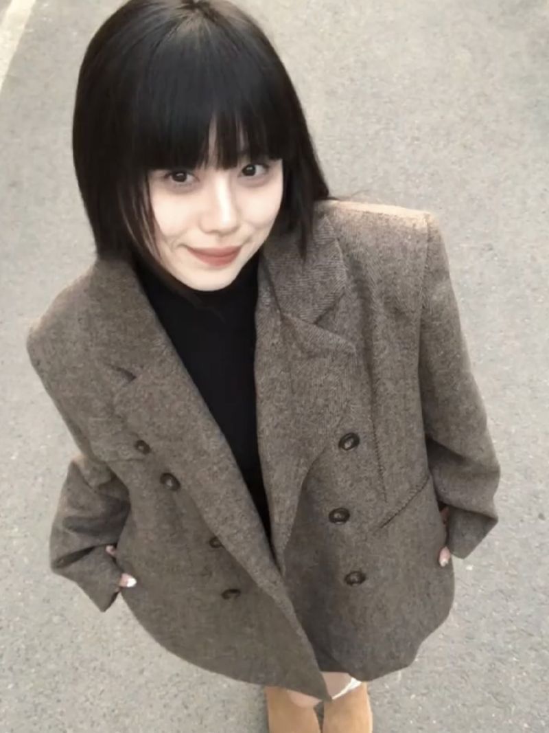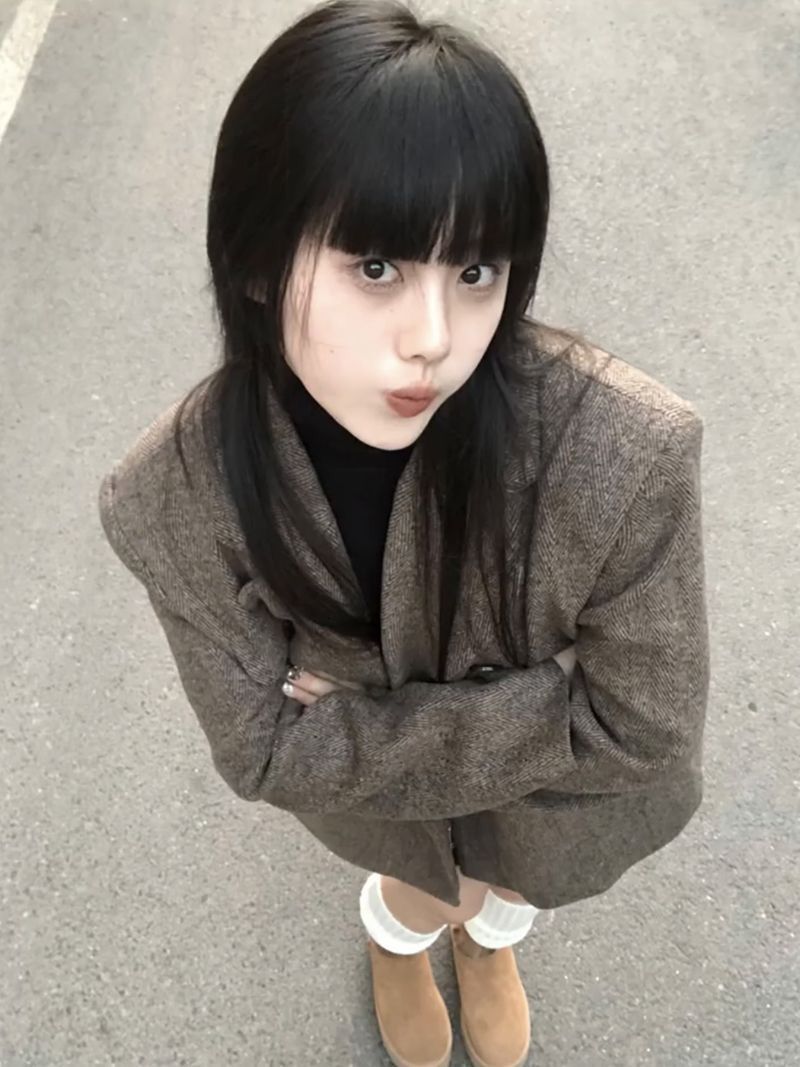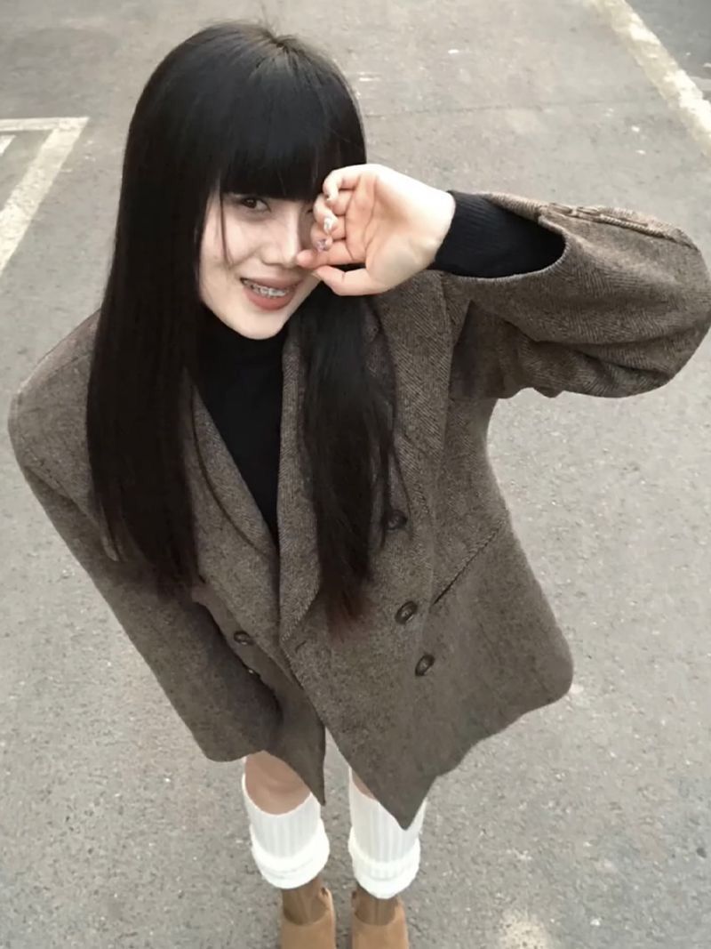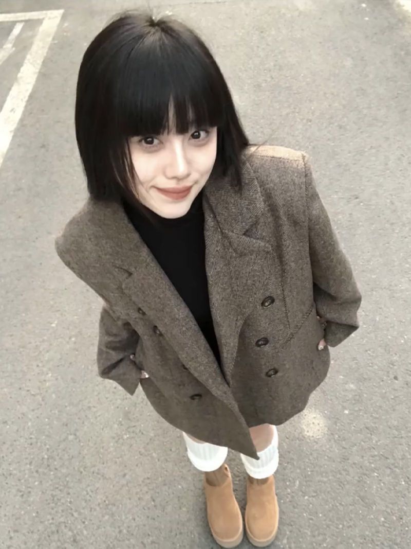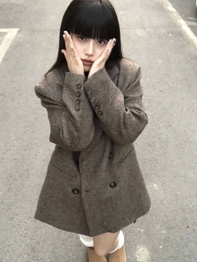 高级感复古咖色毛呢西装外套女冬季小众气质宽松休闲加厚呢子大衣