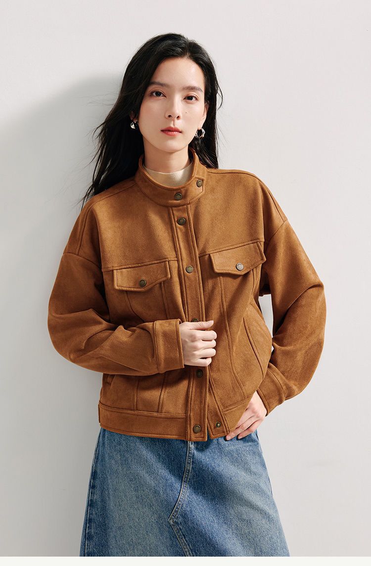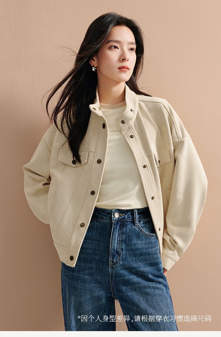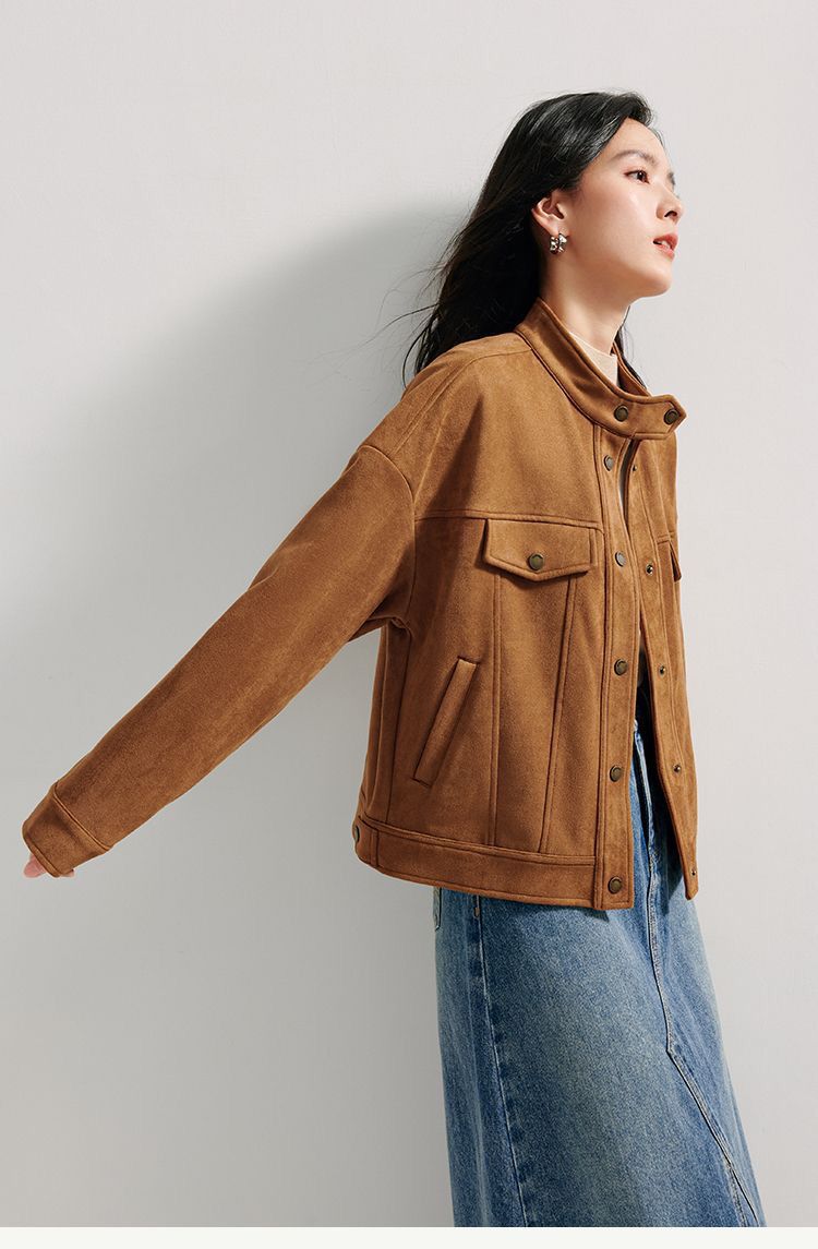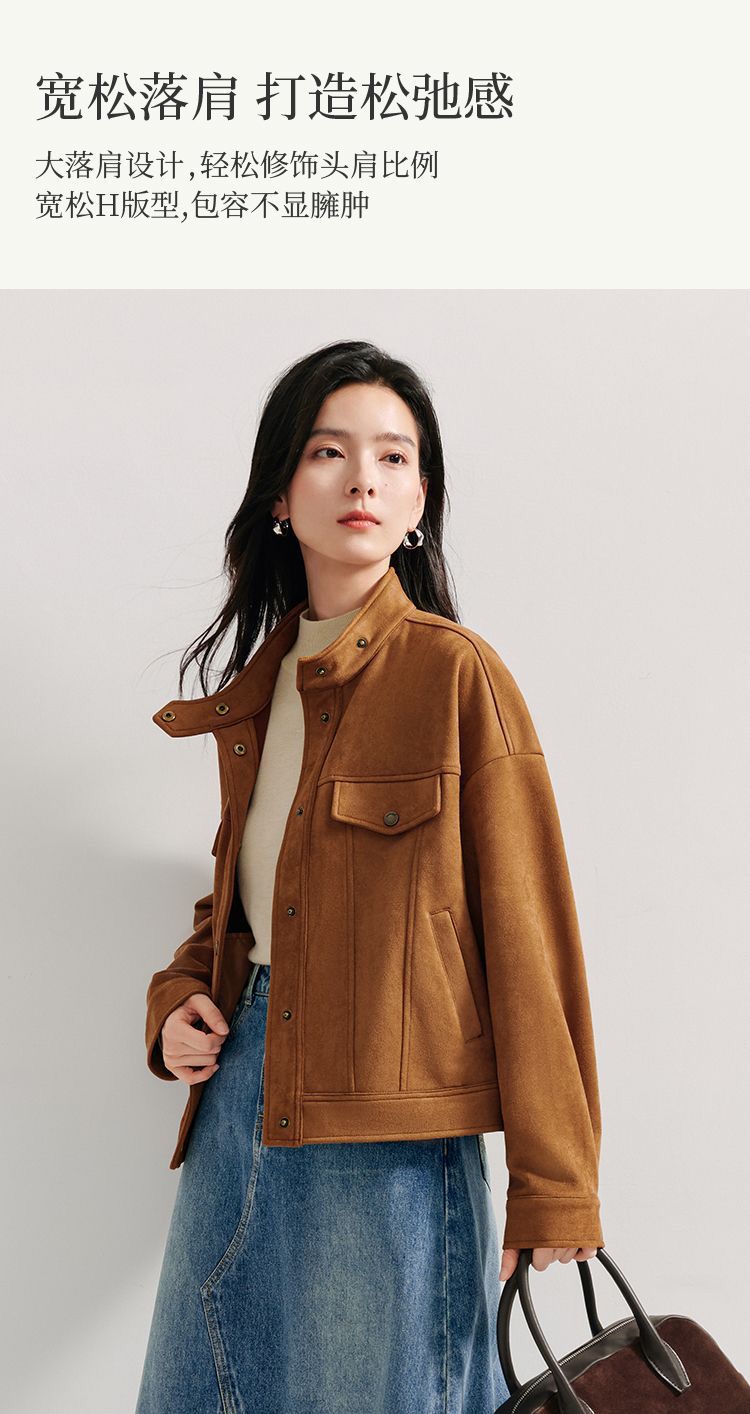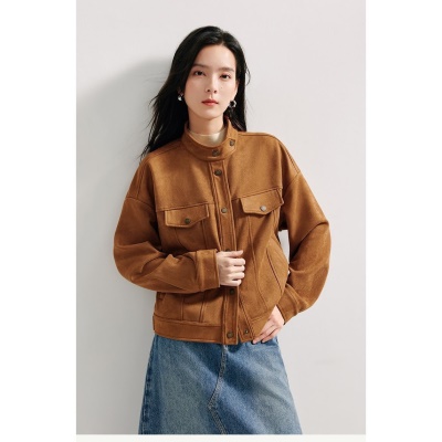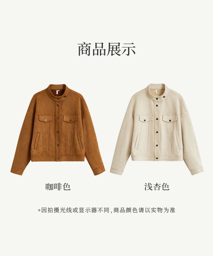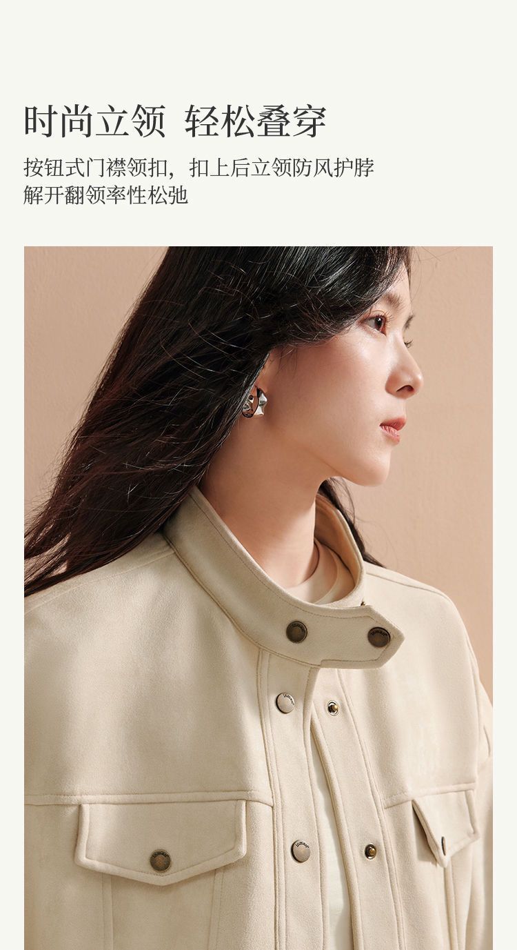 商品名称:麂皮绒休闲短外套女士2026年春秋季新款气质复古工装立领夹克上衣