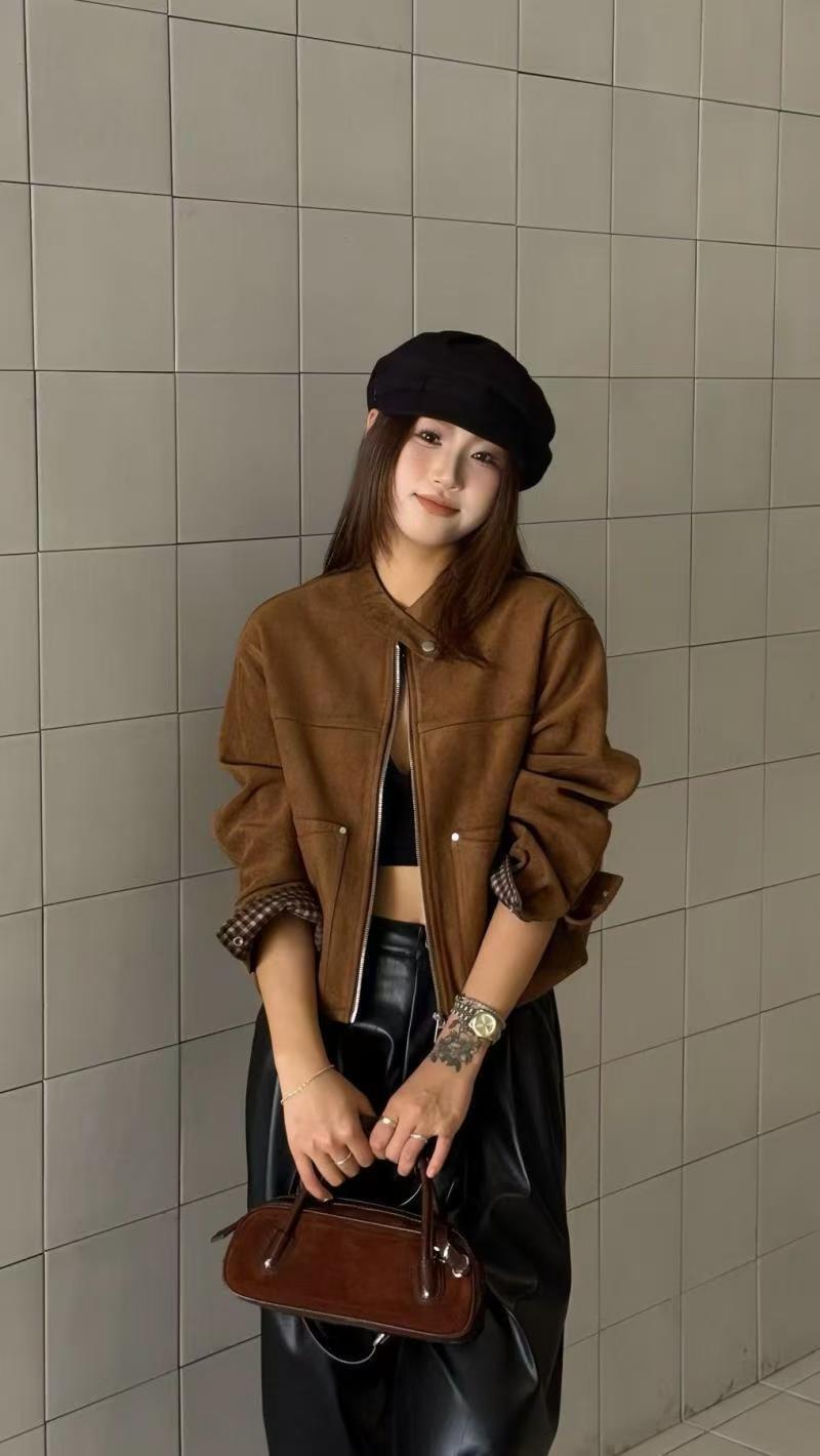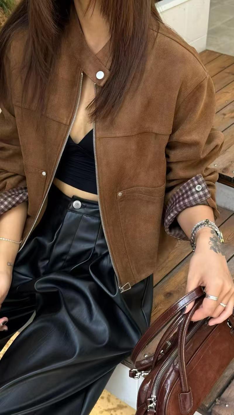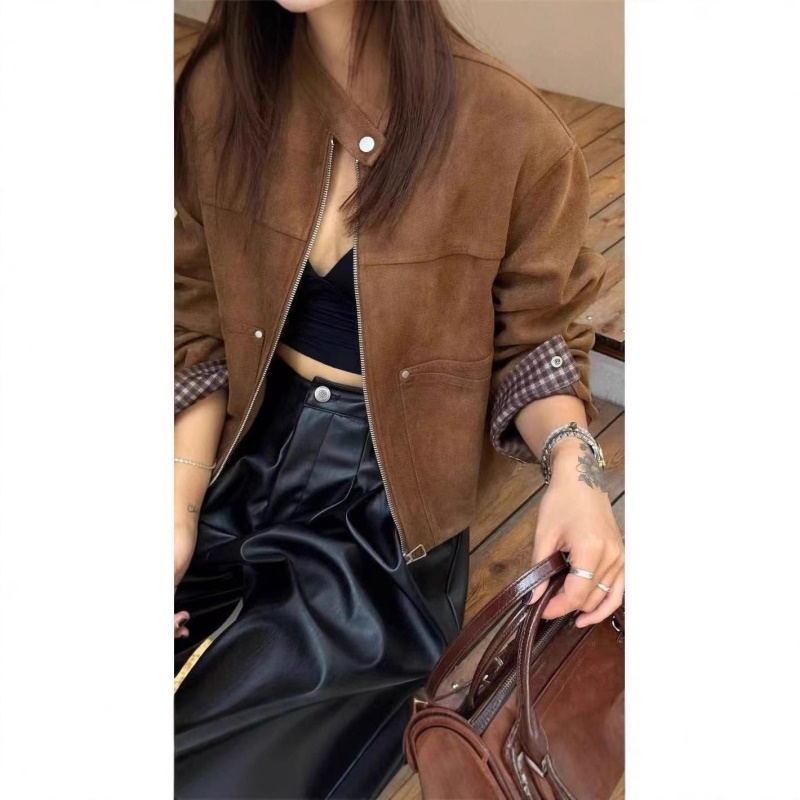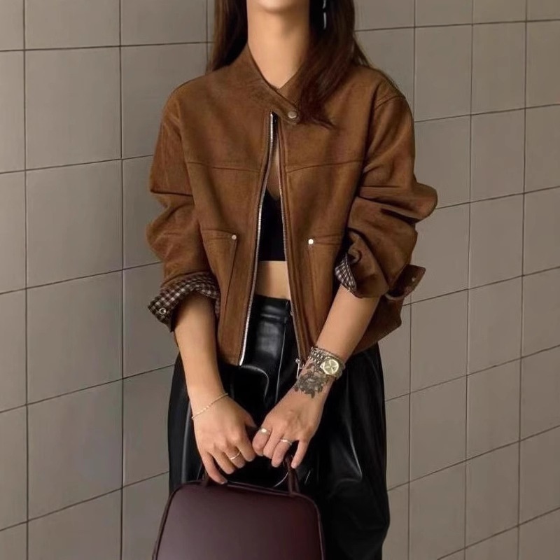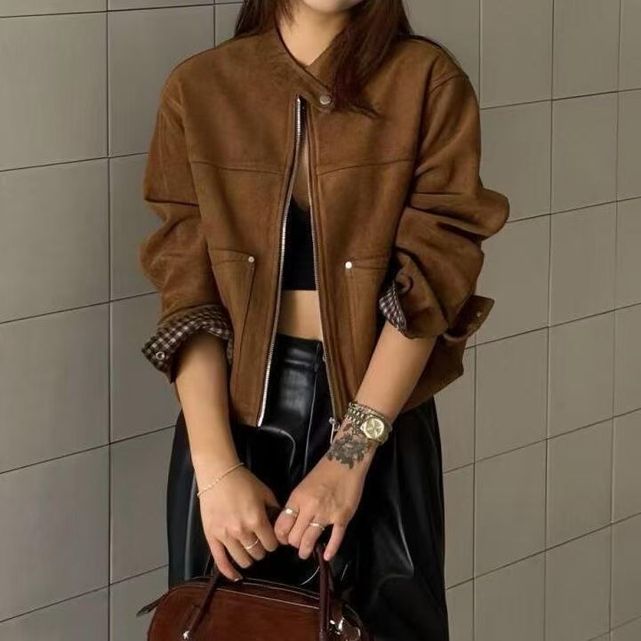 2026秋季新款小个子立领短款休闲鹿皮绒外套宽松上衣夹克款机车风