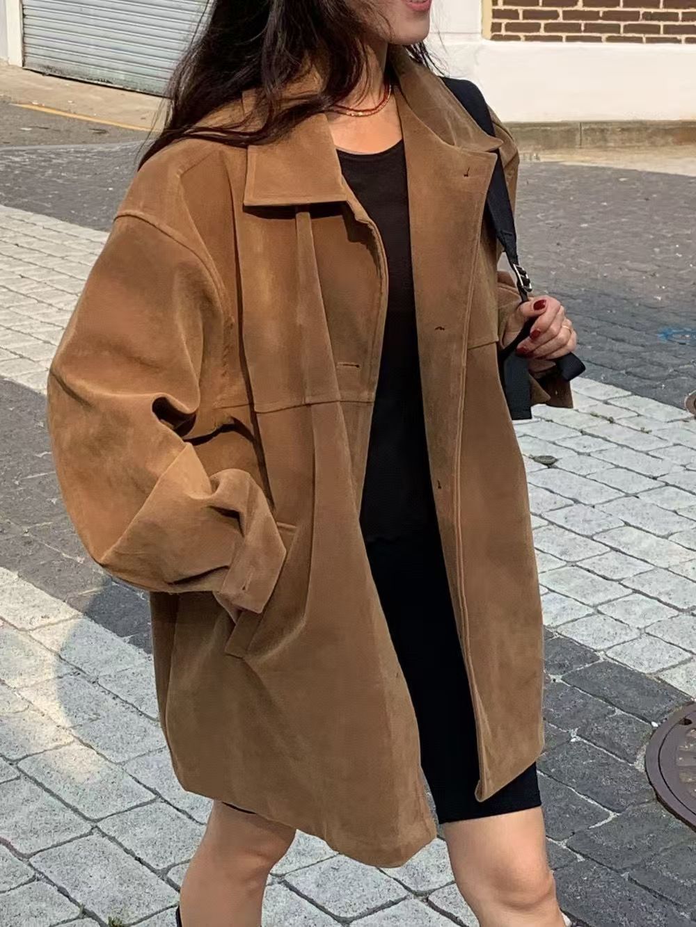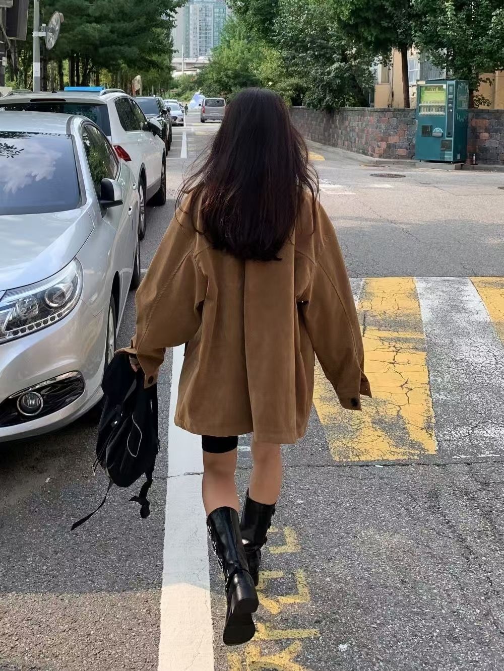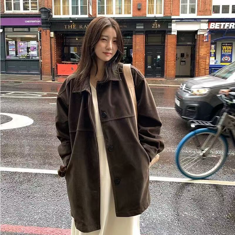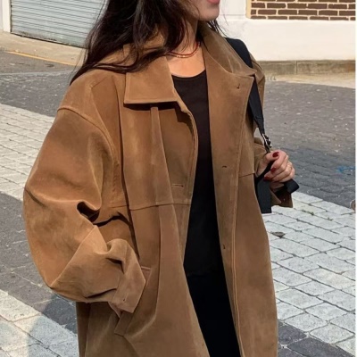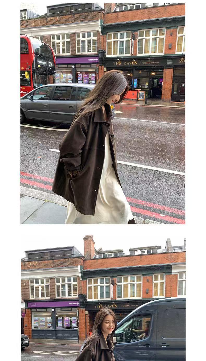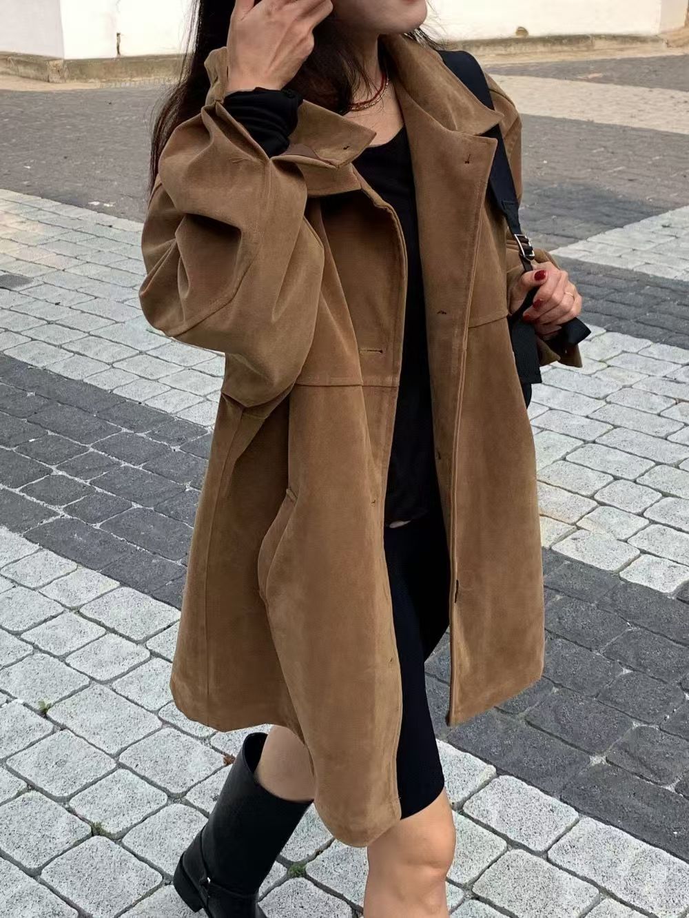 美拉德麂皮绒外套女韩国复古翻领宽松慵懒显瘦秋冬时髦长袖风衣女