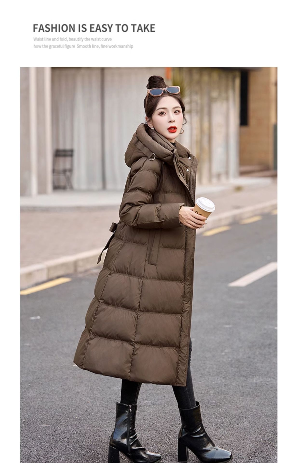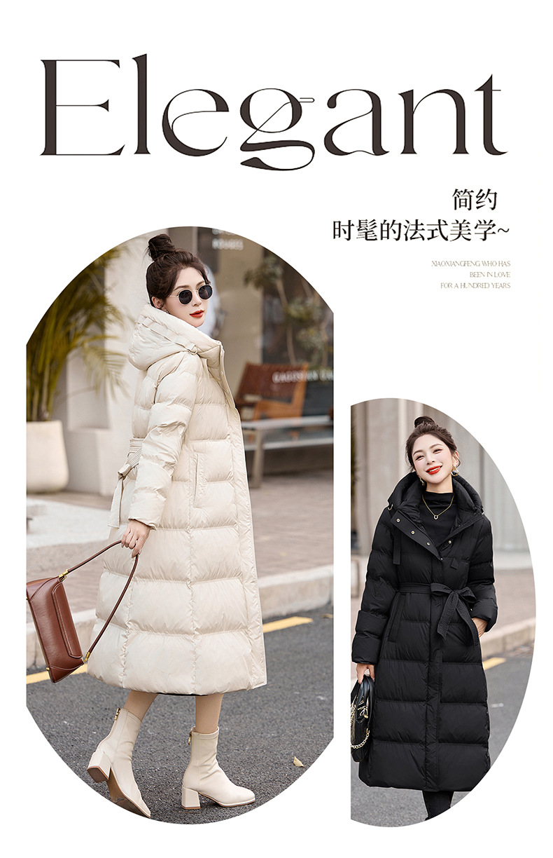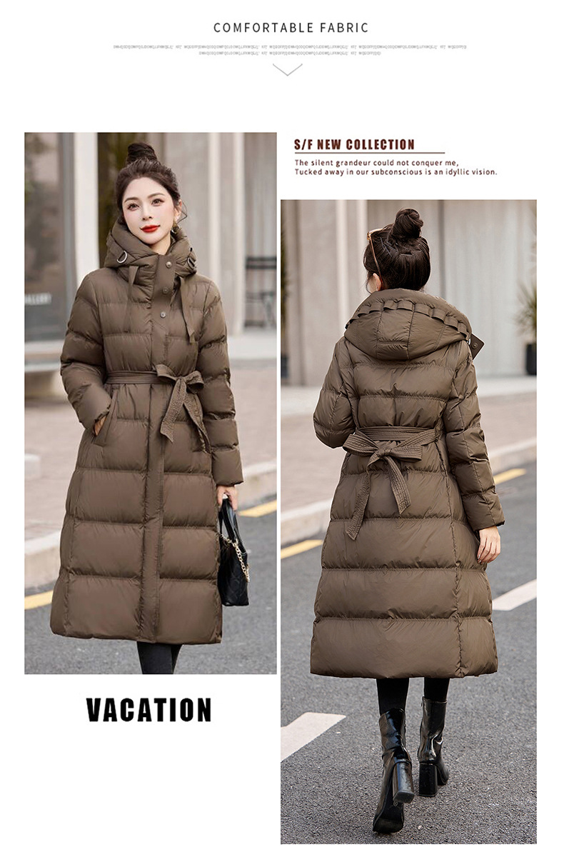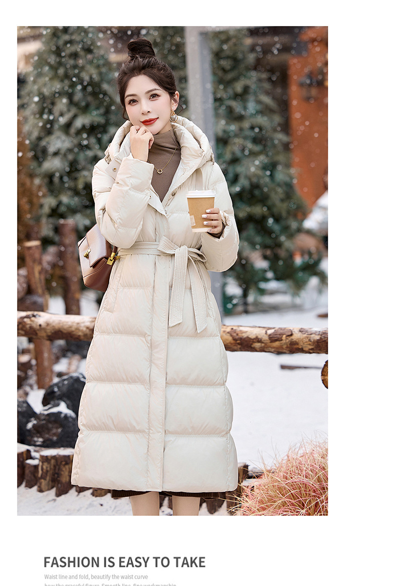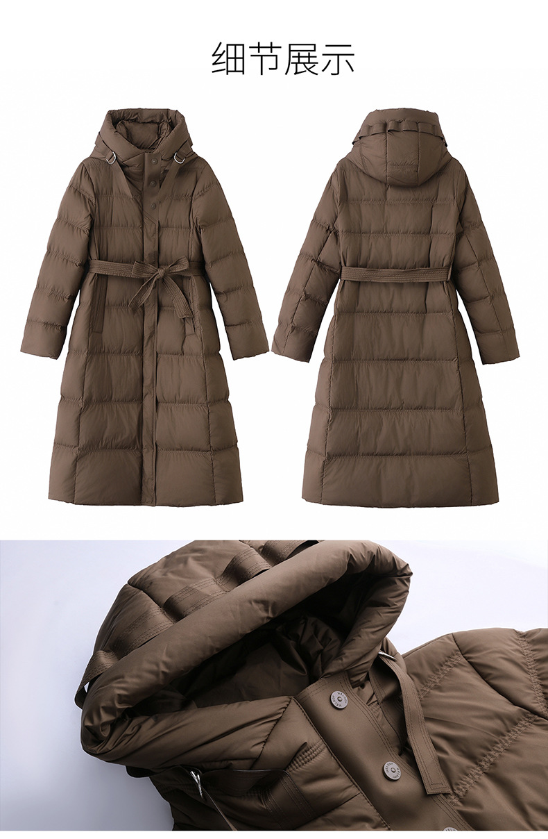 商品名称:鹅绒服女长款过膝2026冬季新款连帽收腰修身显瘦加厚鹅绒腰带外套