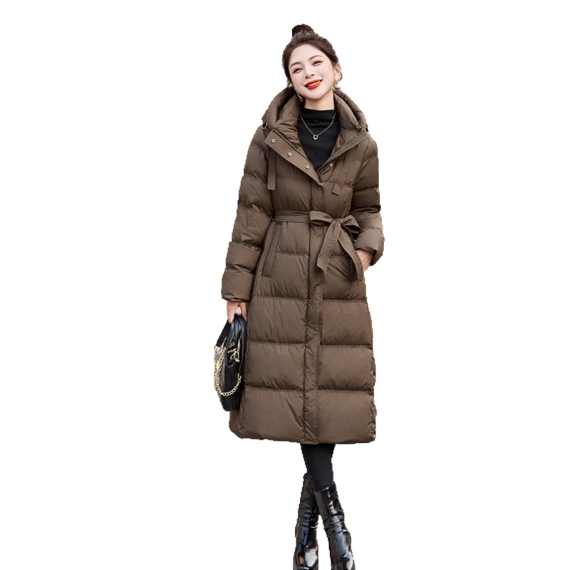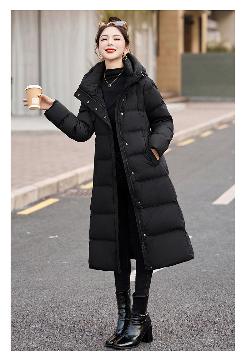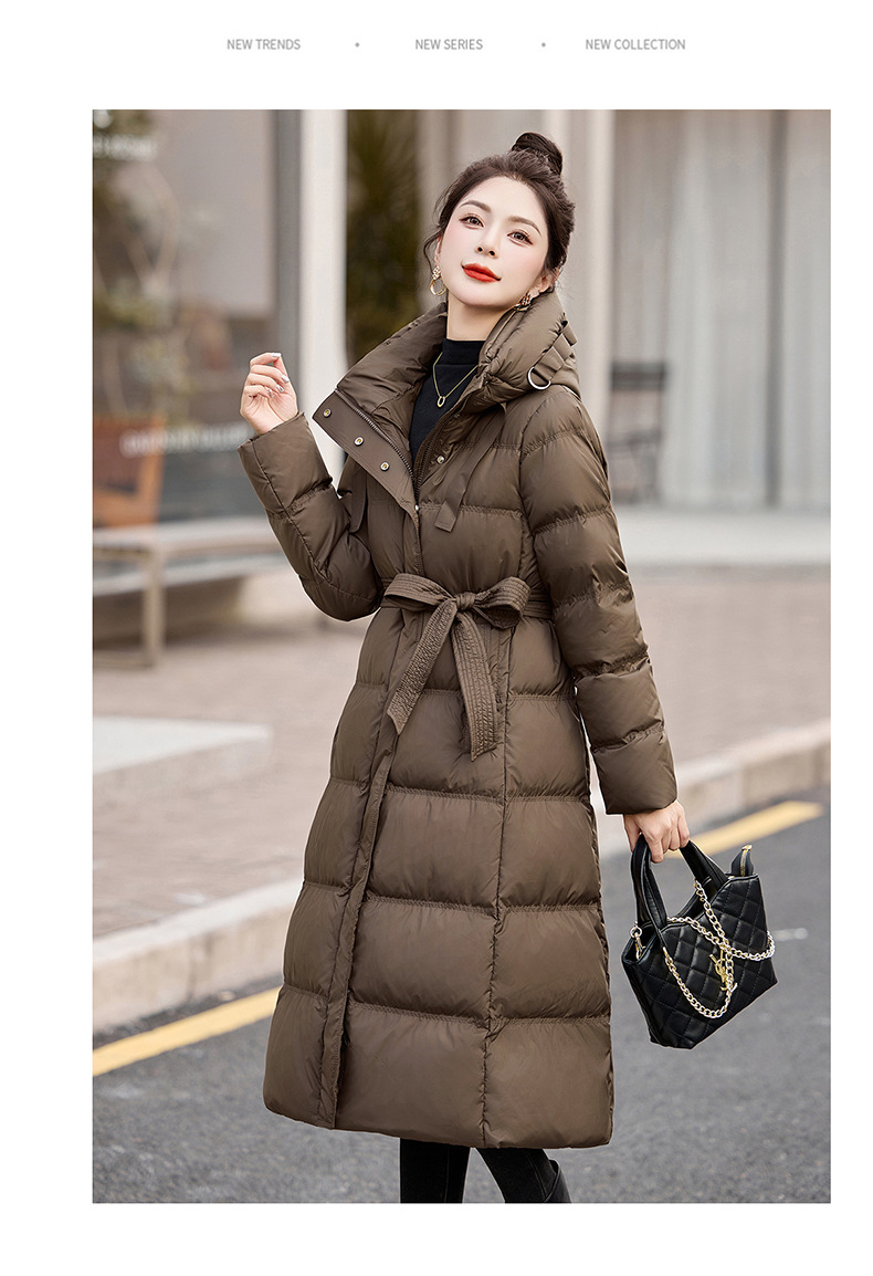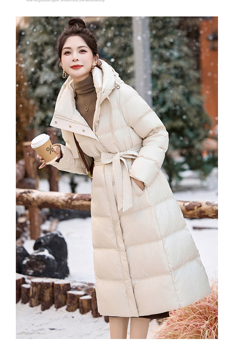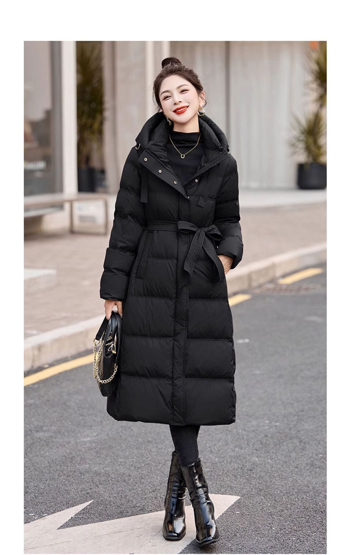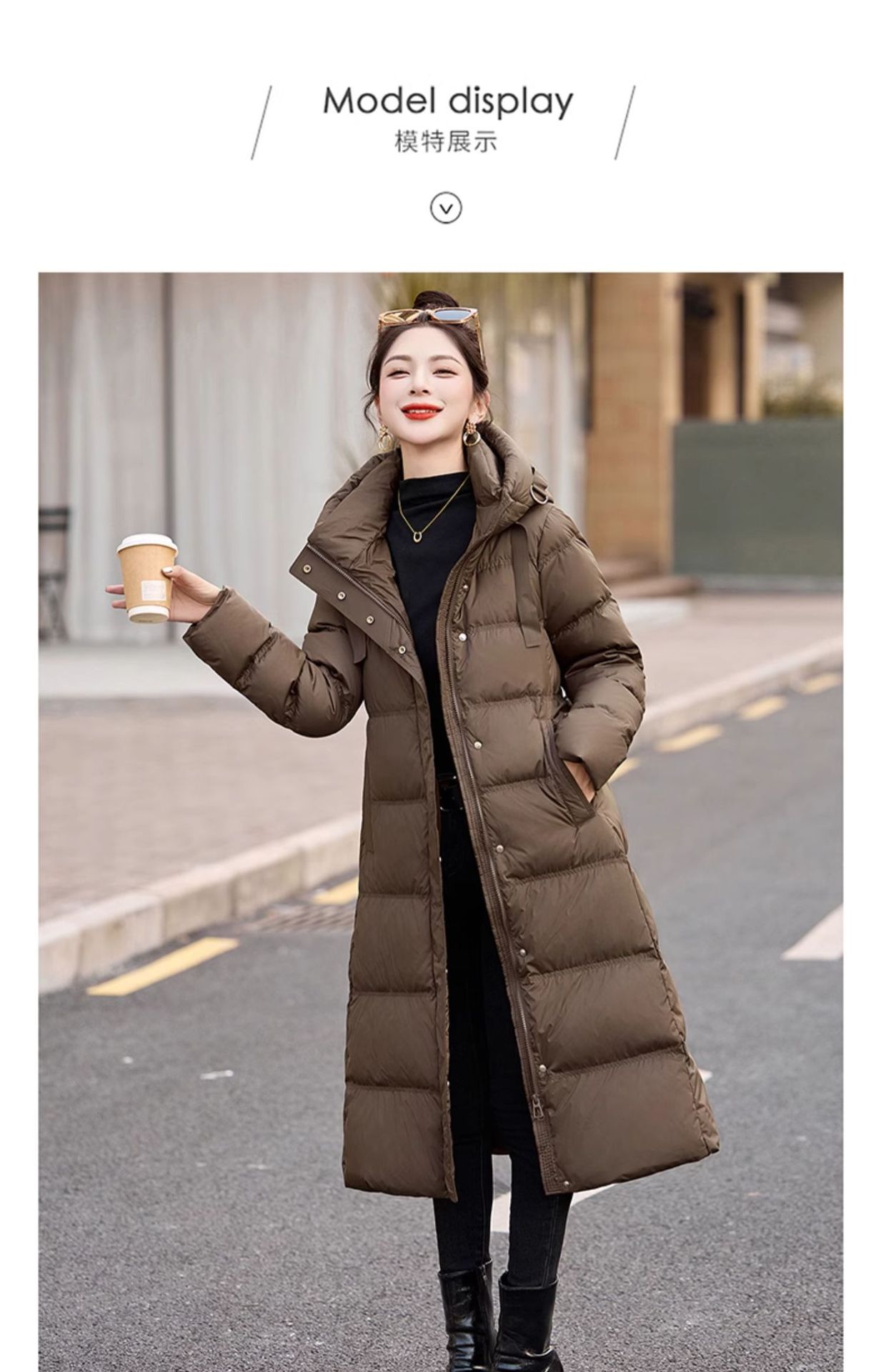 商品名称:鹅绒服女长款过膝2026冬季新款连帽收腰修身显瘦加厚鹅绒腰带外套