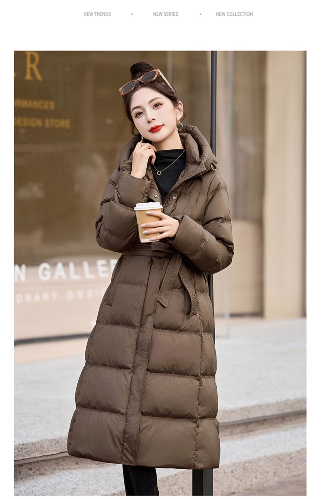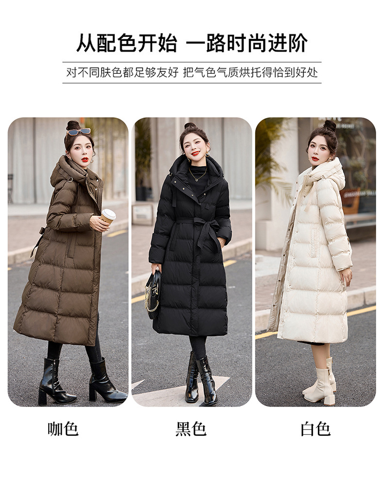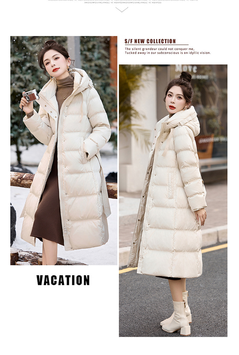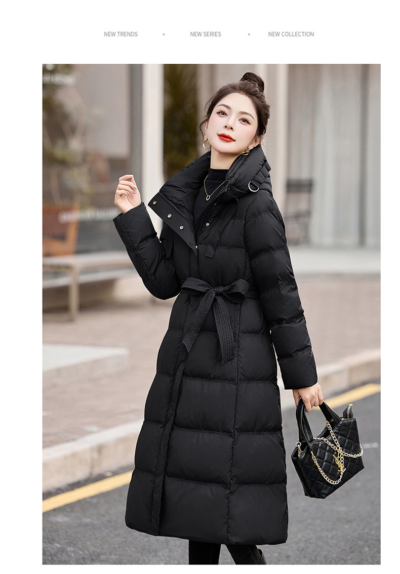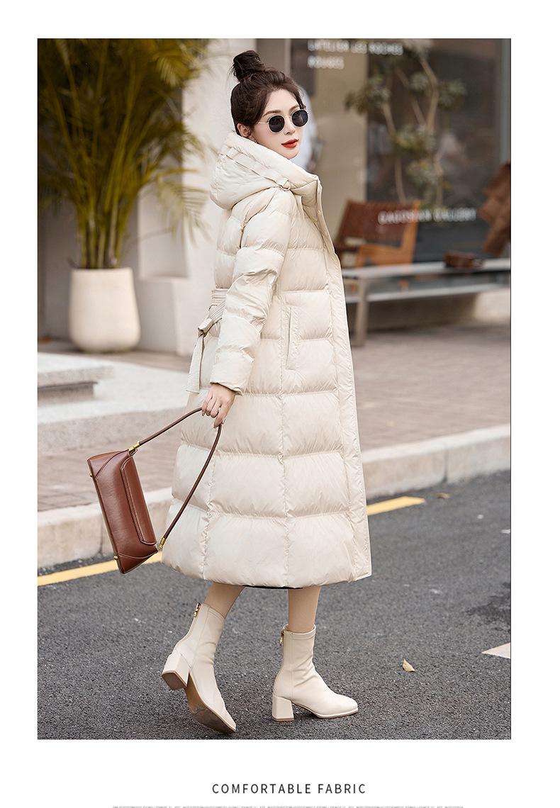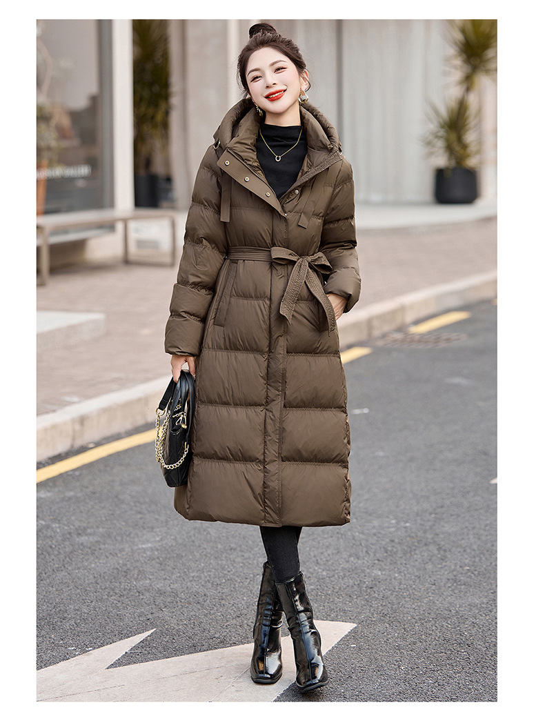 商品名称:鹅绒服女长款过膝2026冬季新款连帽收腰修身显瘦加厚鹅绒腰带外套
