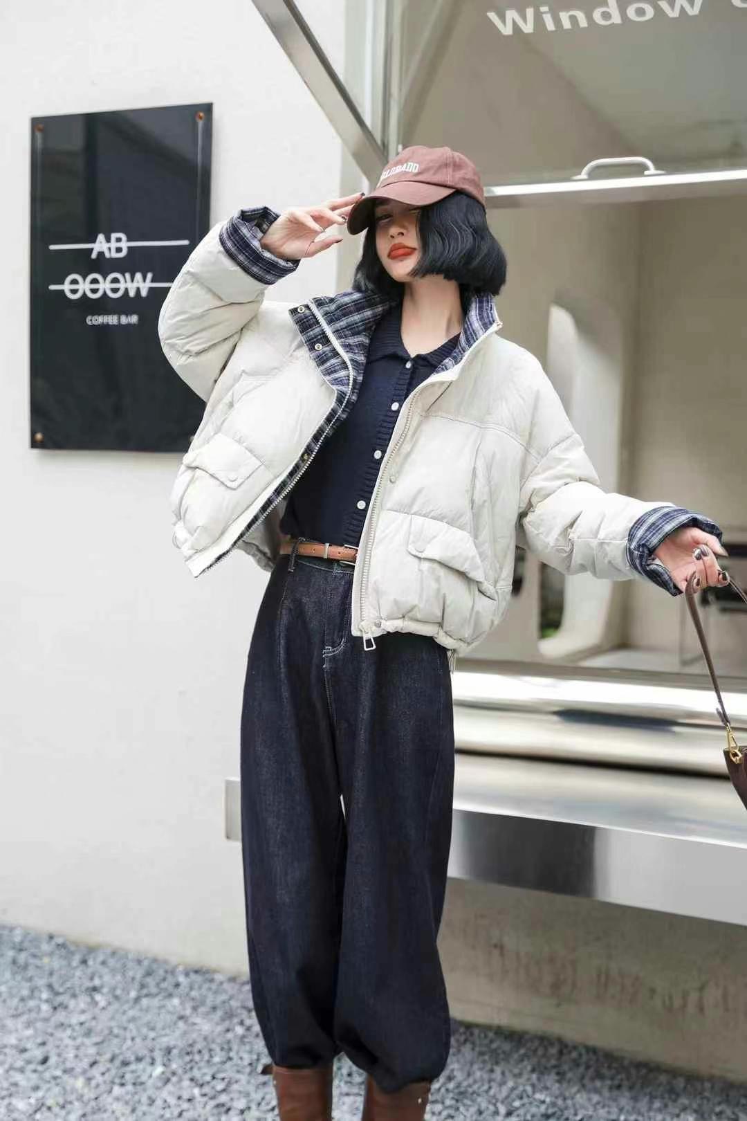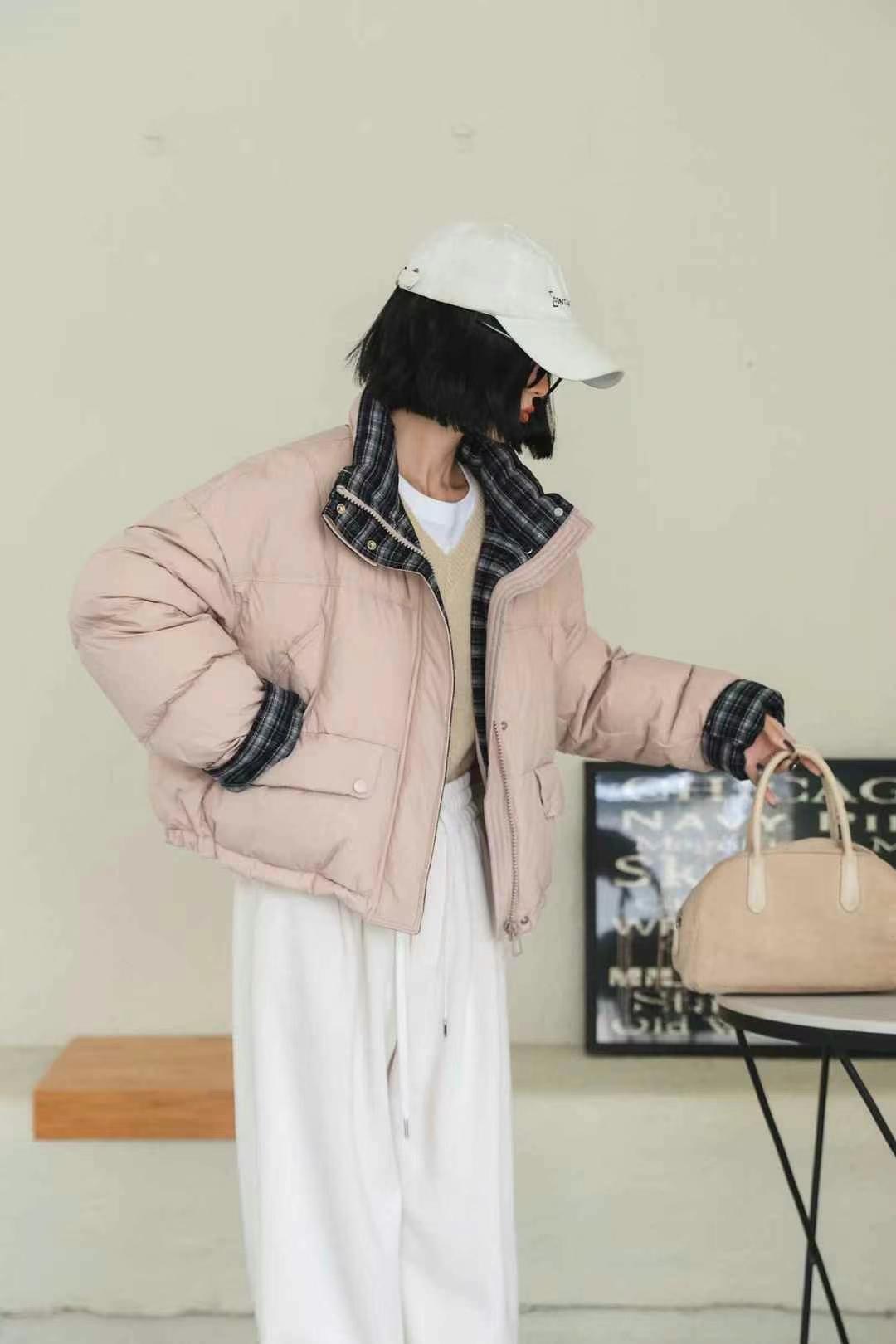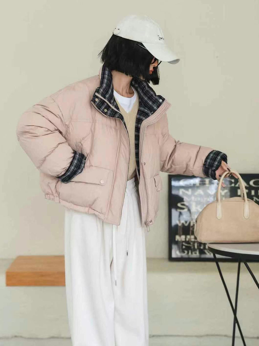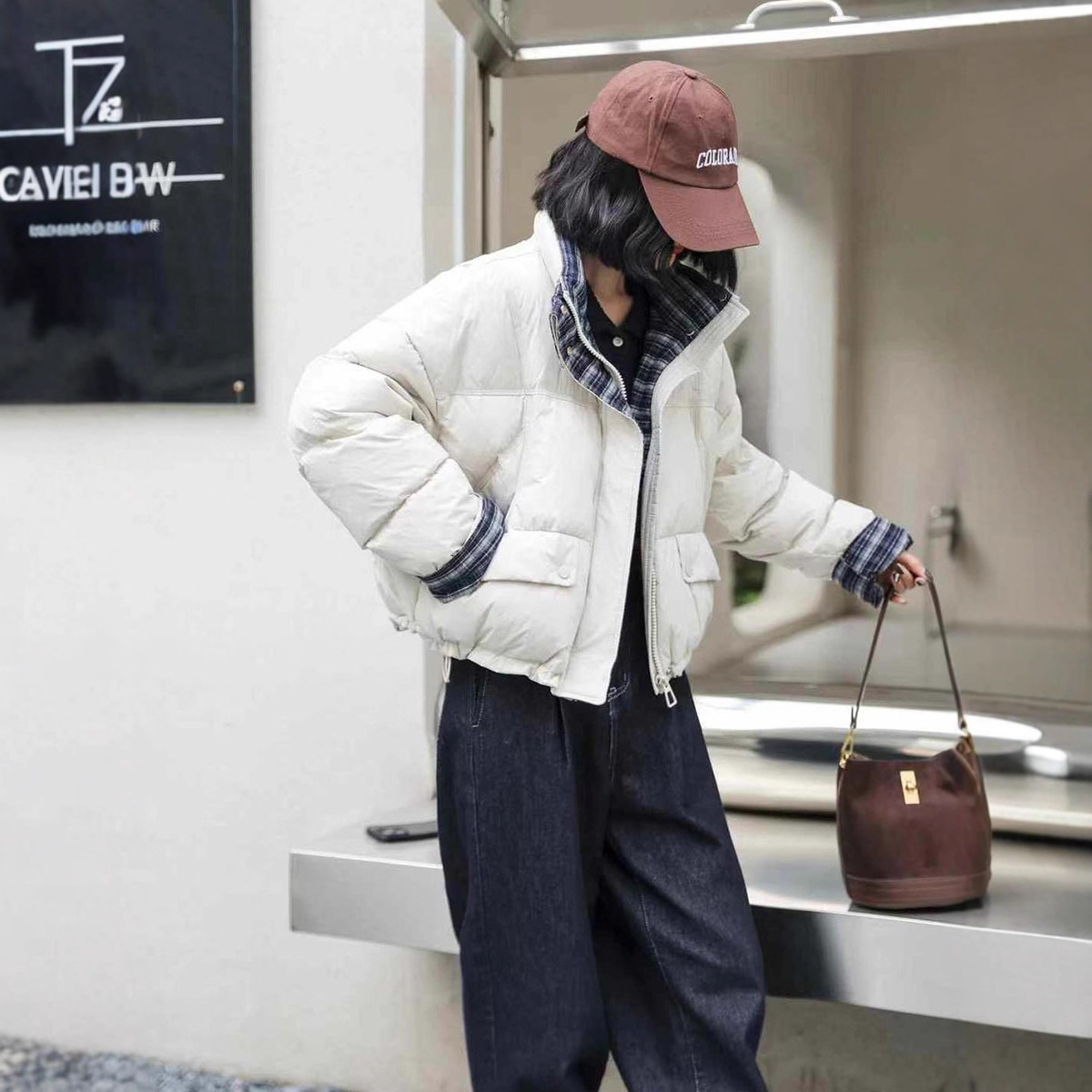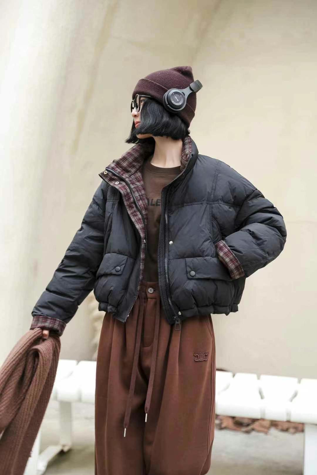 2026冬季新款韩版宽松立领撞色格子袖口女短外套 小个子鹅绒服