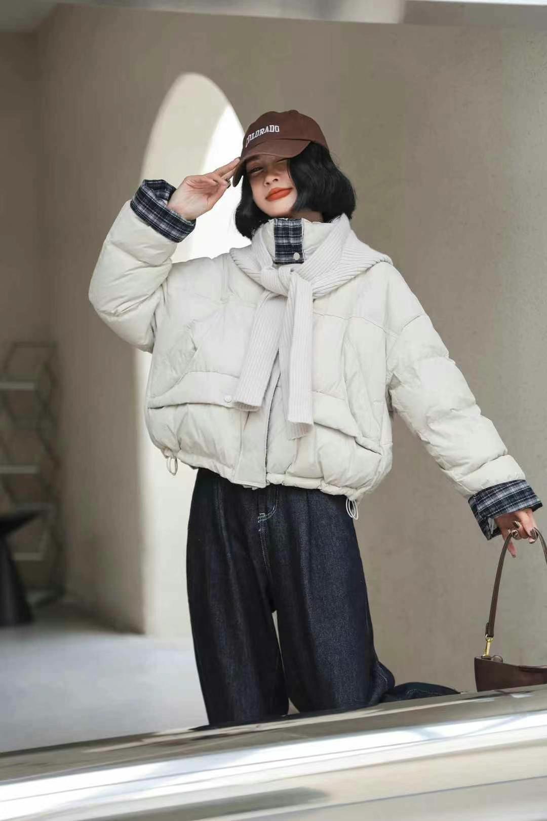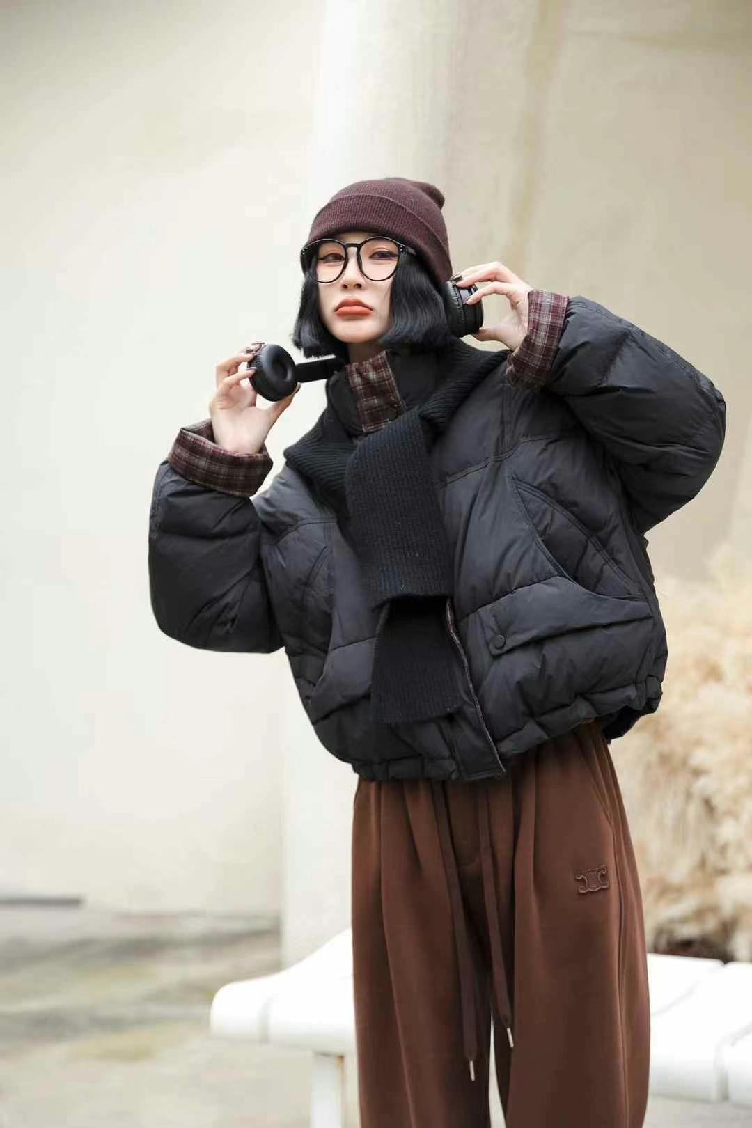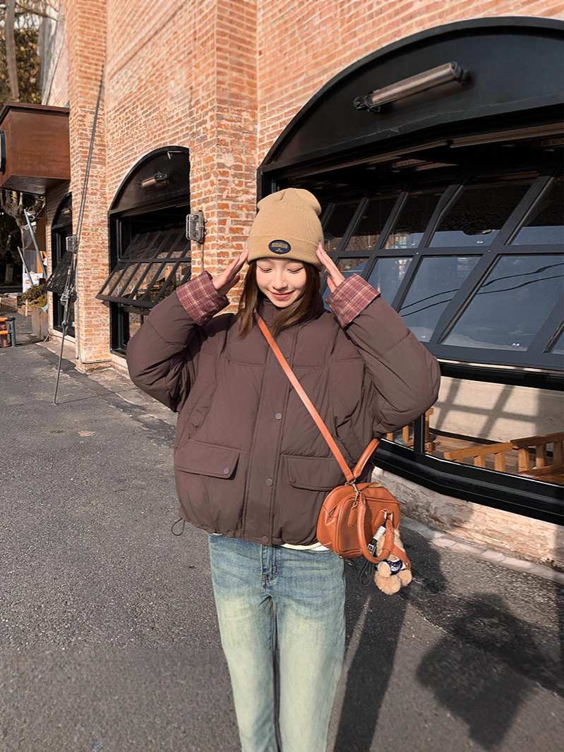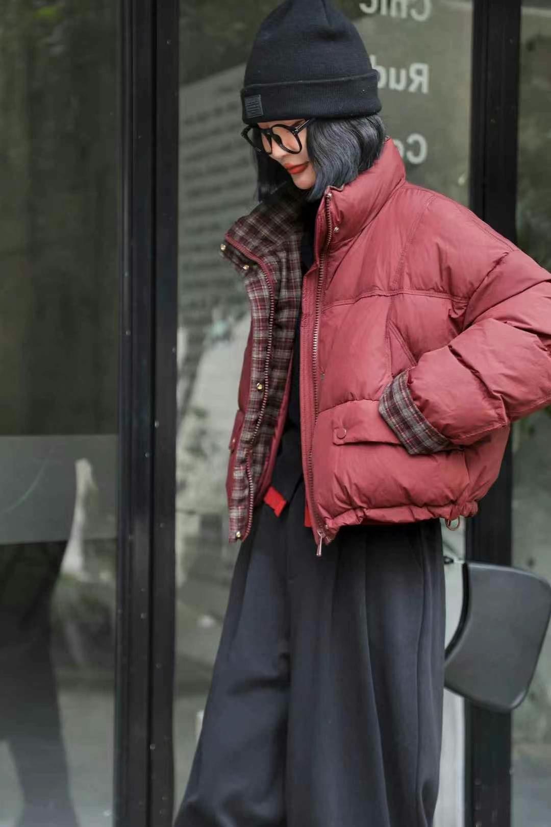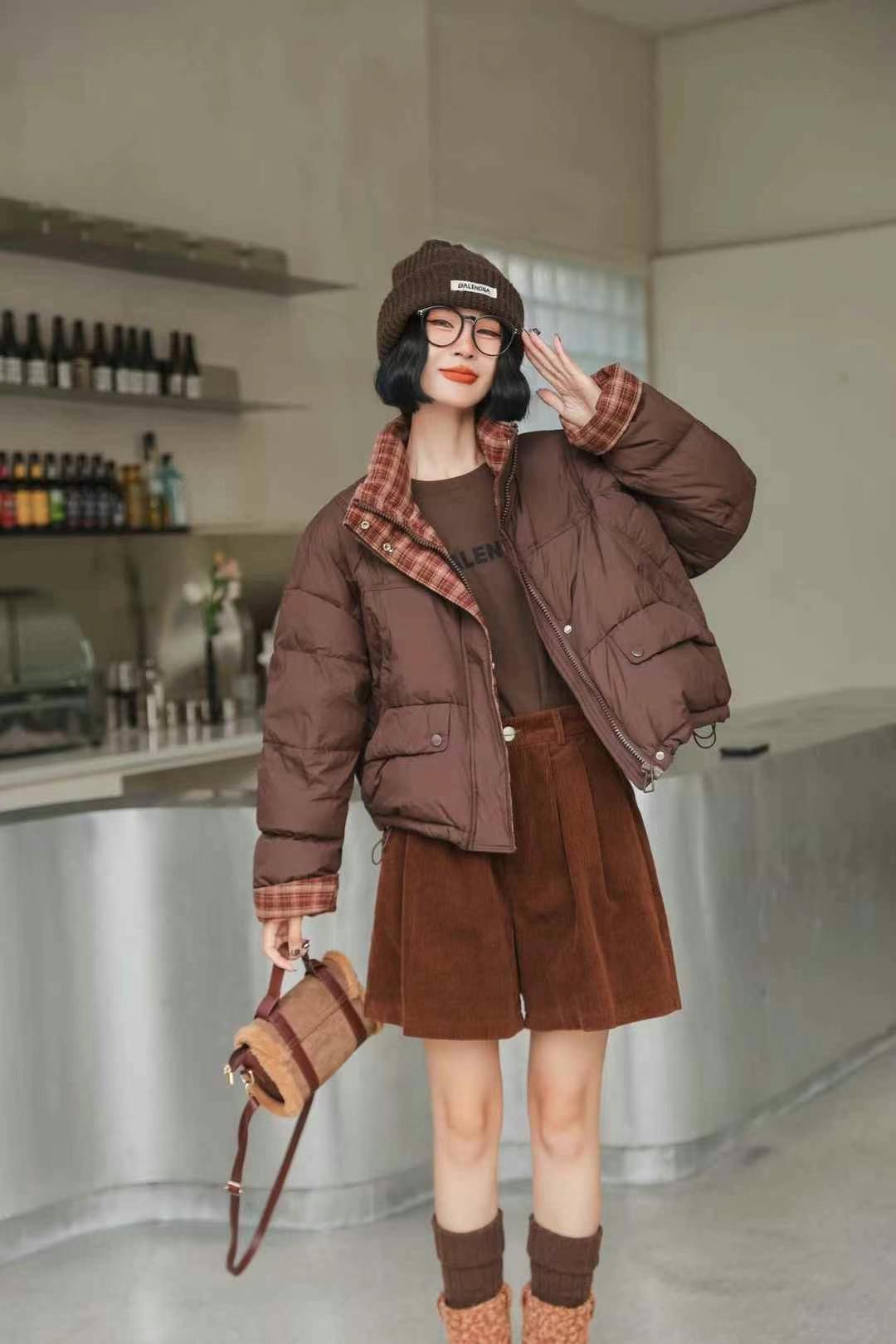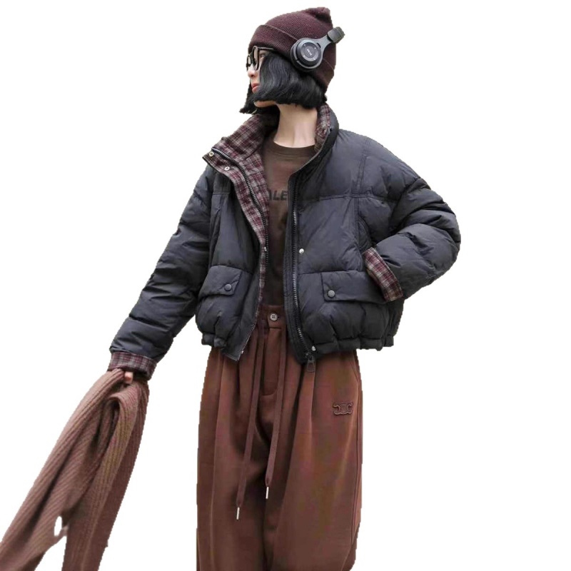 2026冬季新款韩版宽松立领撞色格子袖口女短外套 小个子鹅绒服