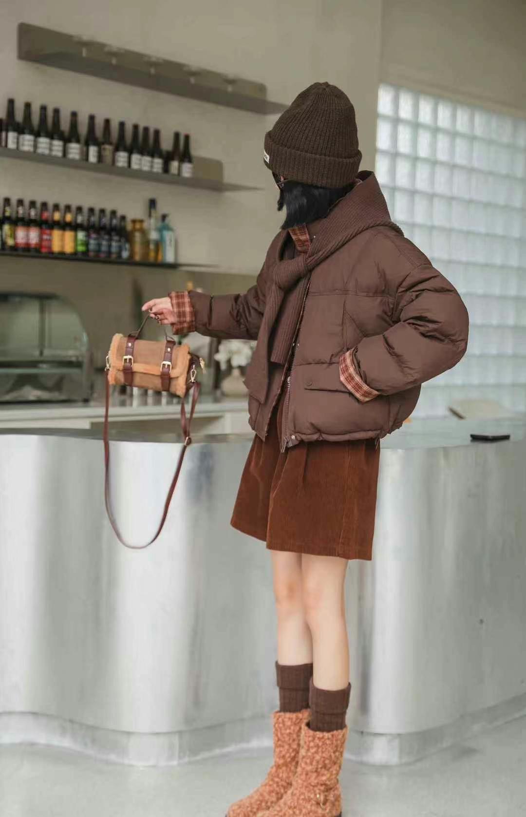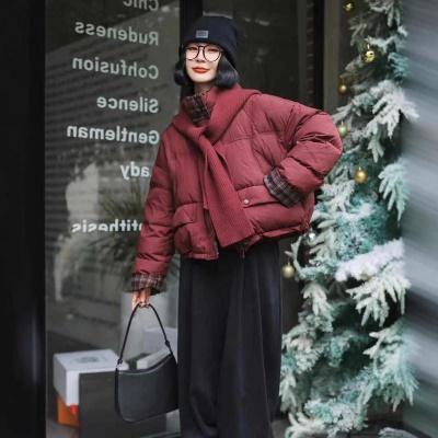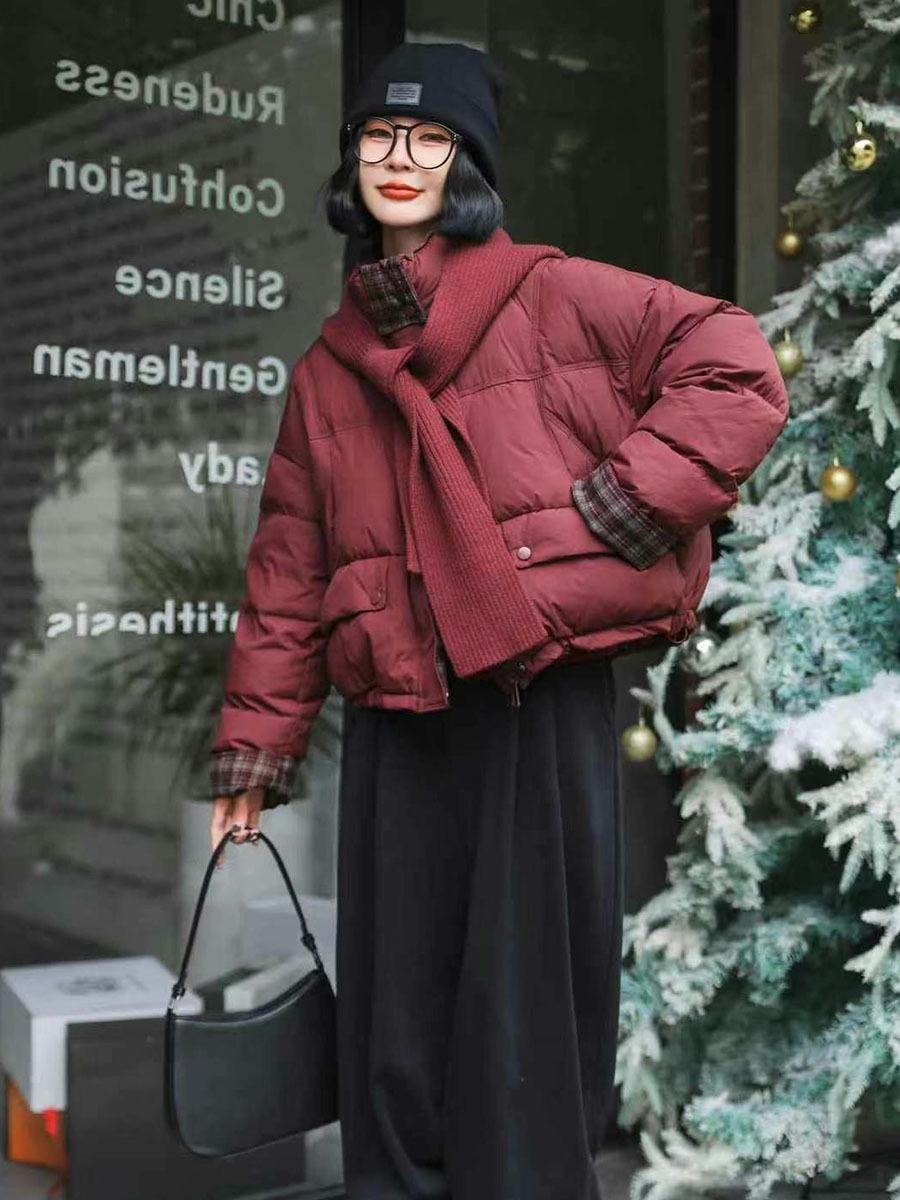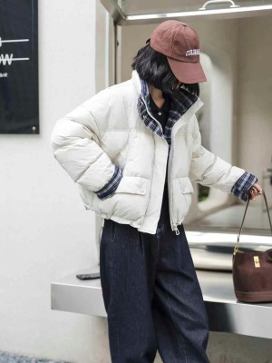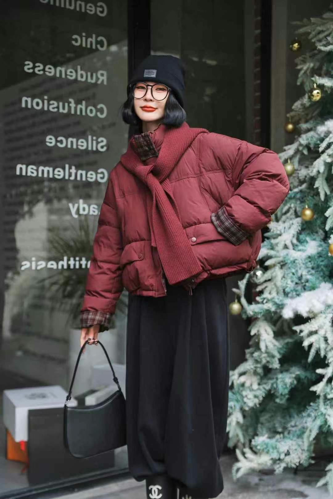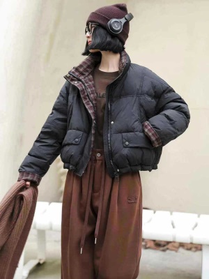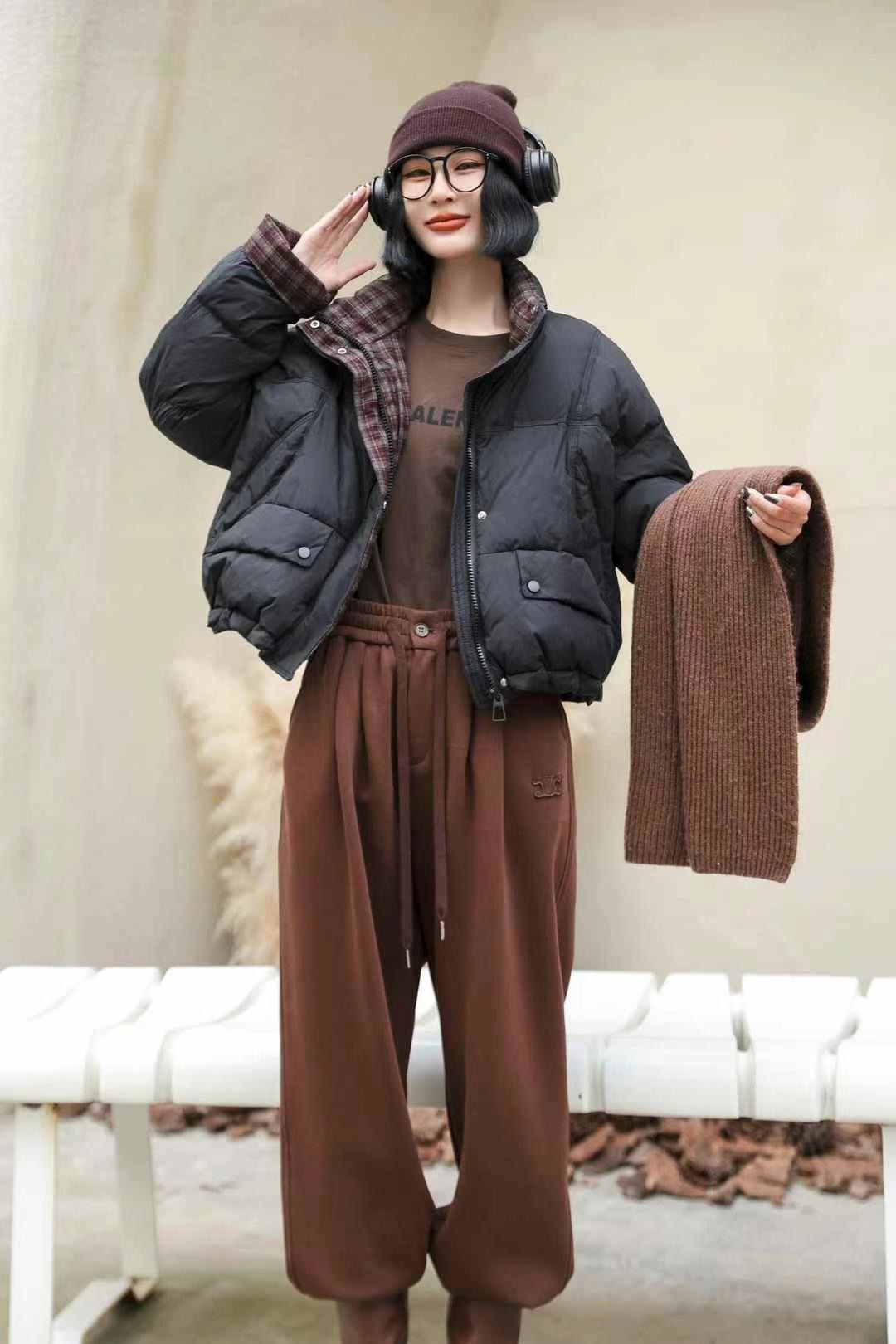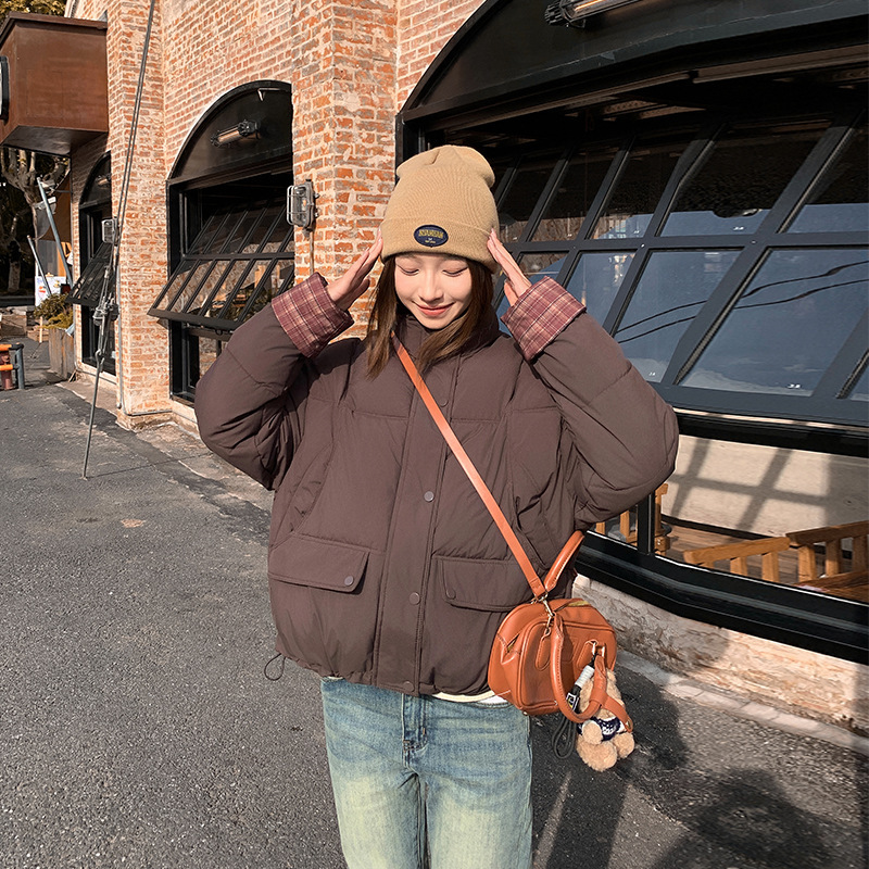2026冬季新款韩版宽松立领撞色格子袖口女短外套 小个子鹅绒服