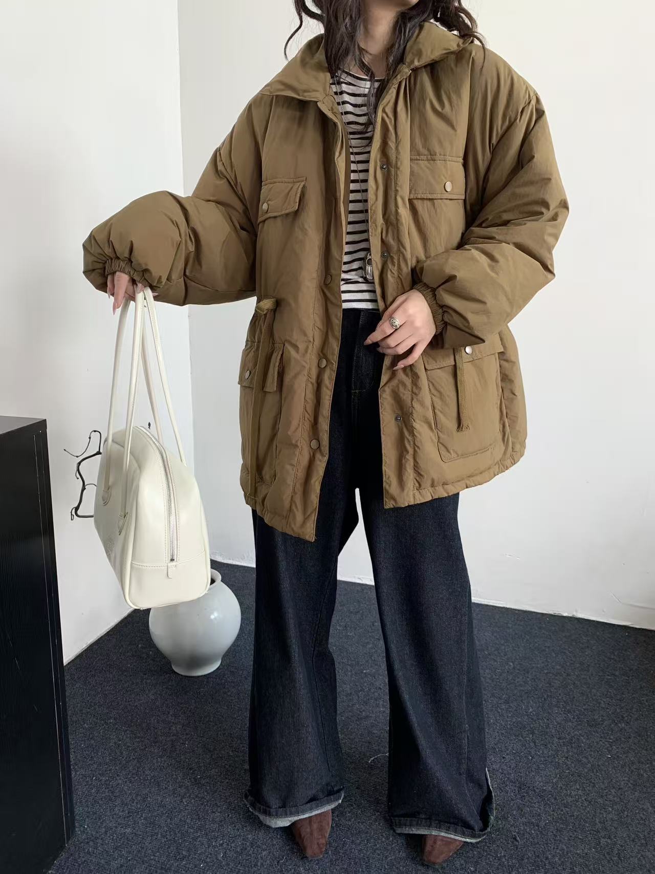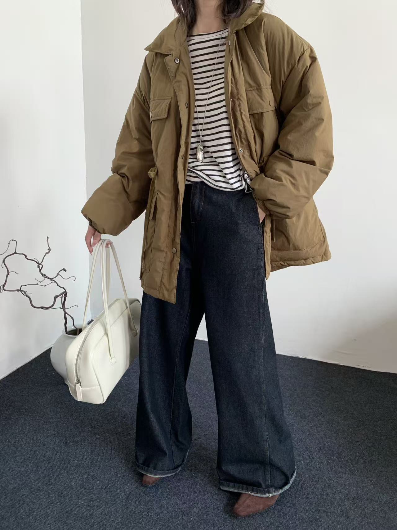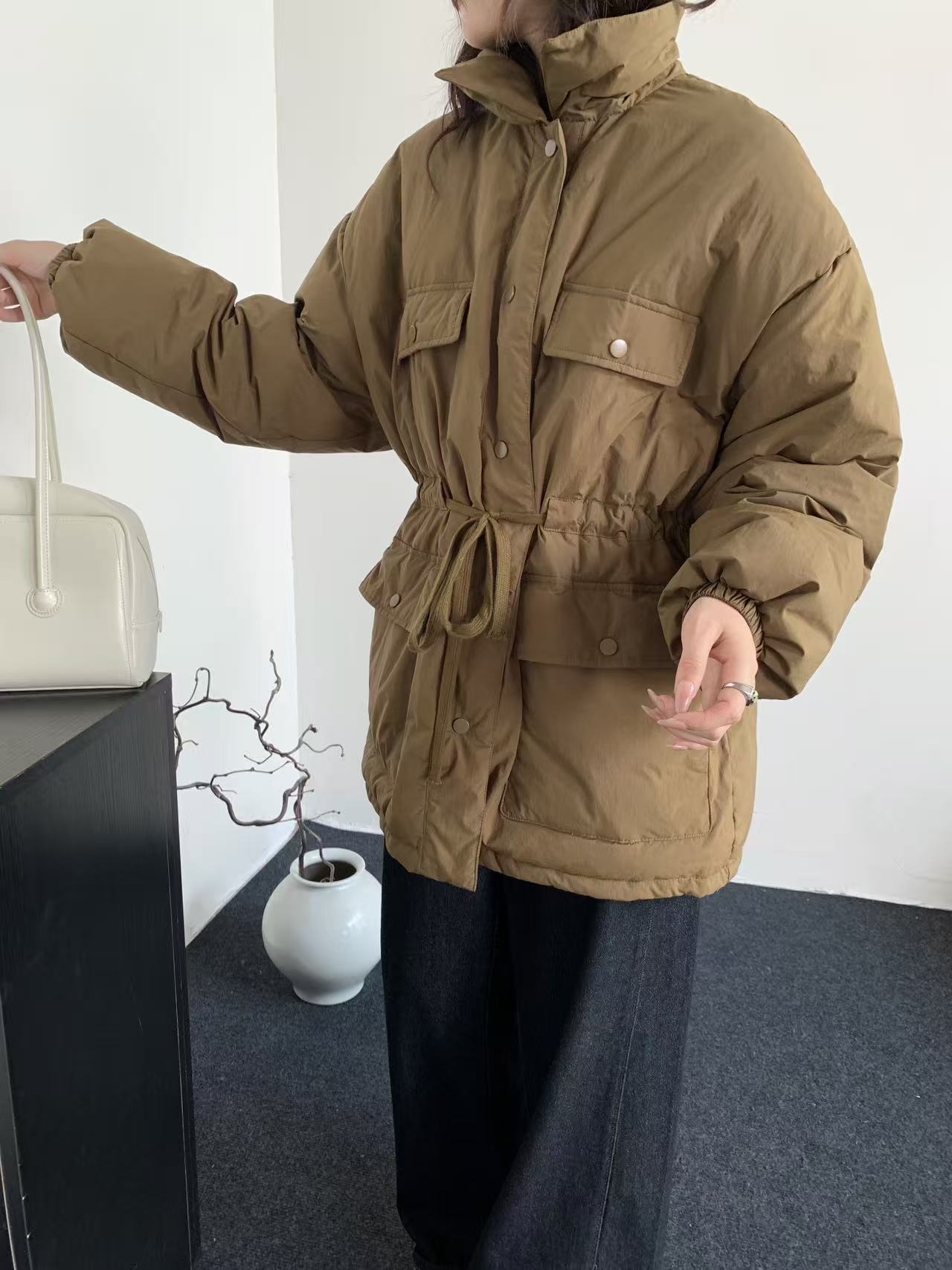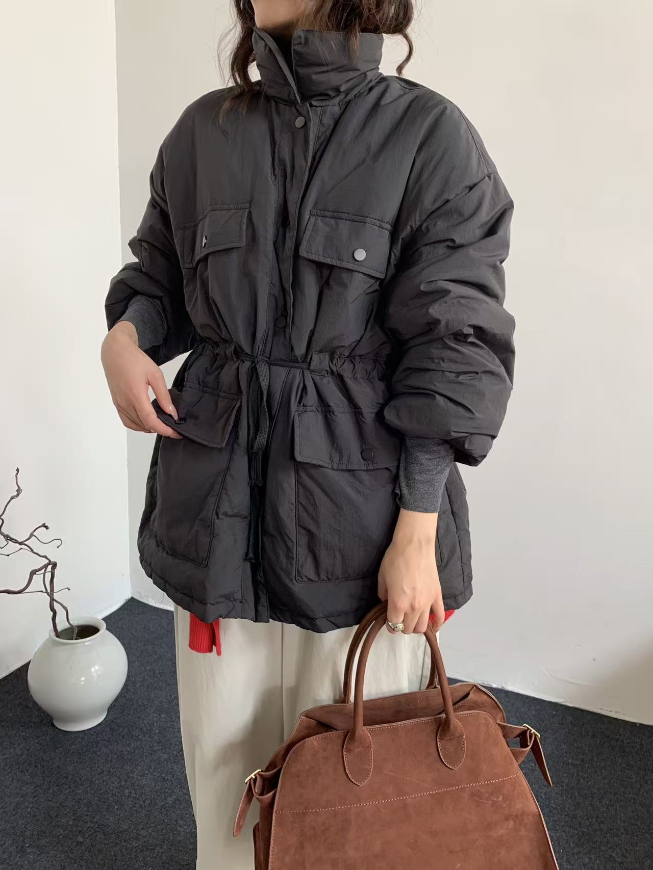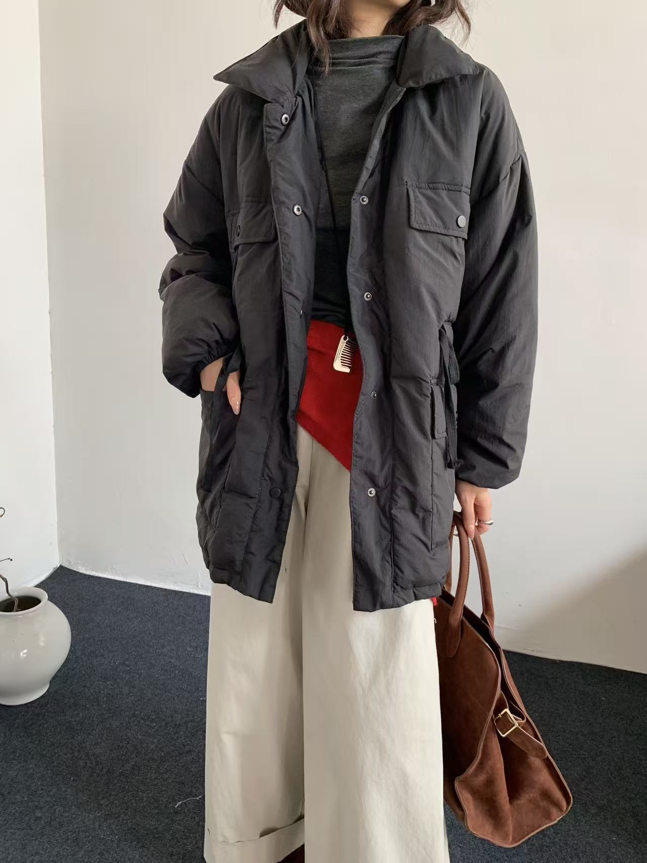 韩系东大门中长款90鹅绒服女宽松收腰简约羽绒服冬季新款轻薄外套