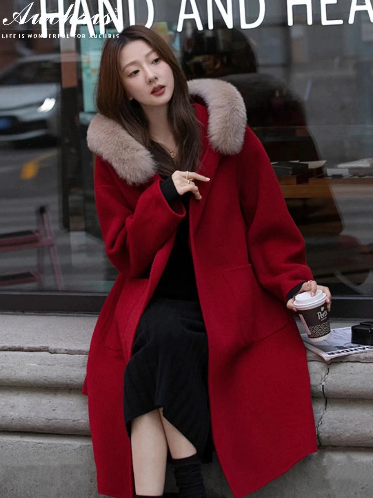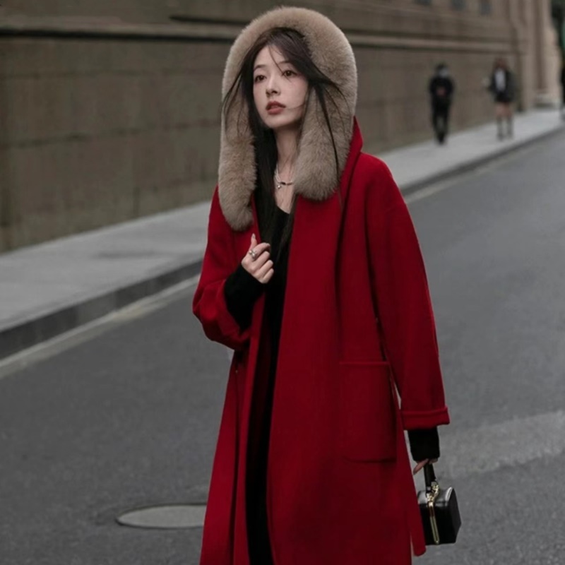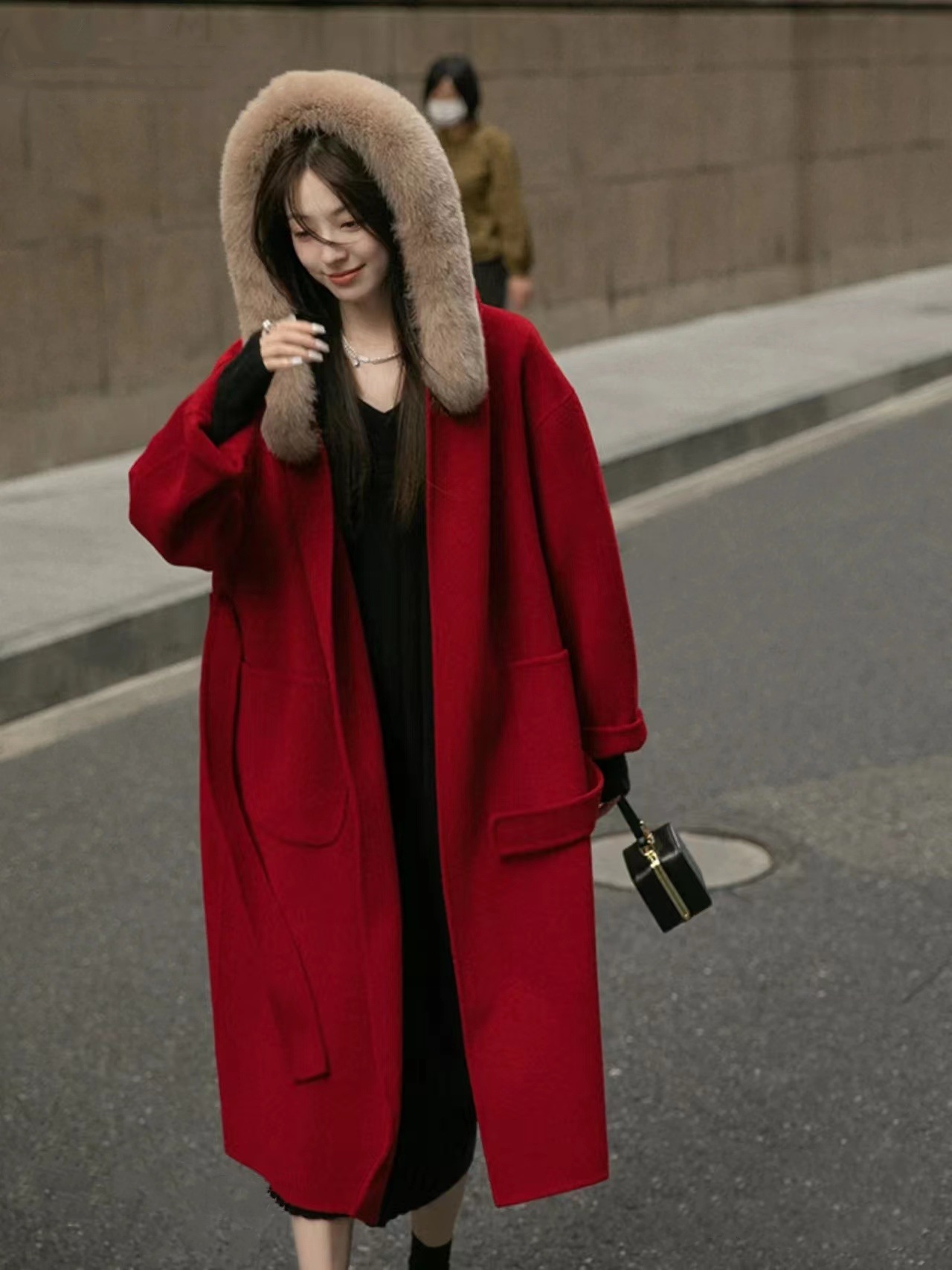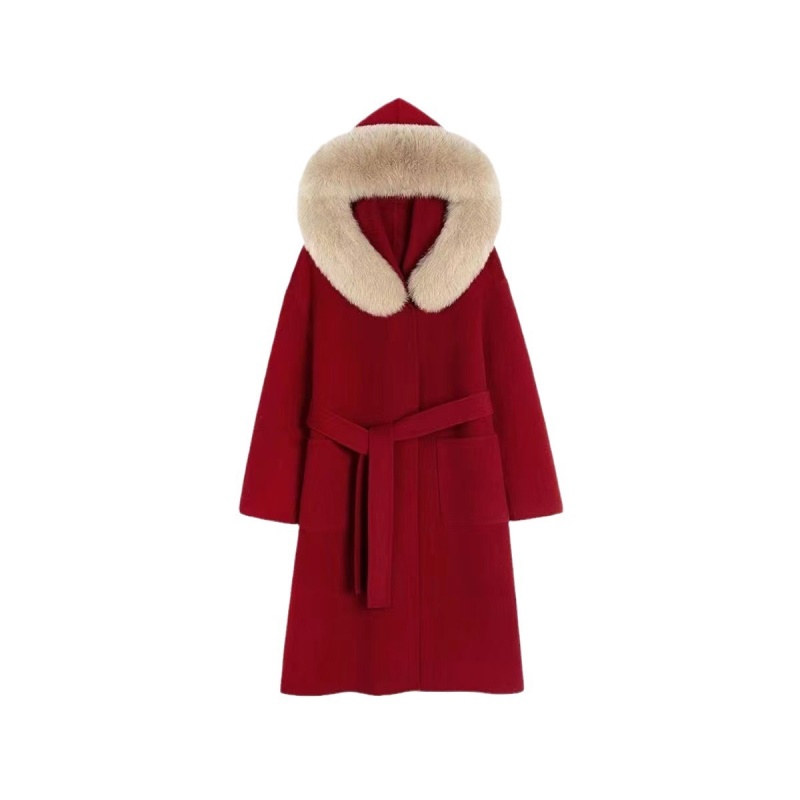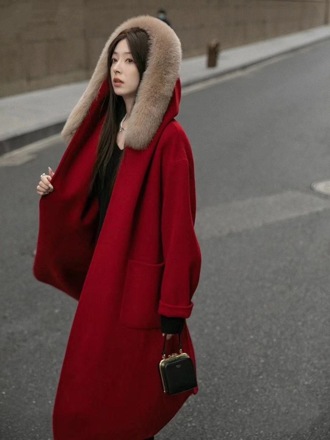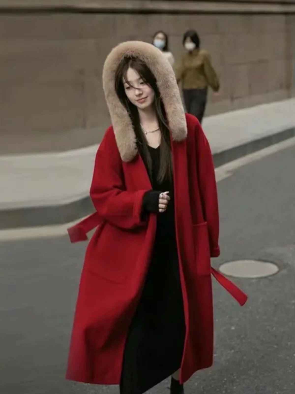 新年红色大衣狐狸毛毛领连帽羊毛大衣秋冬季加厚羊绒高级感外套女