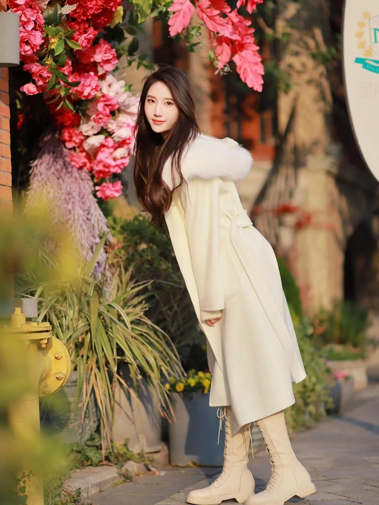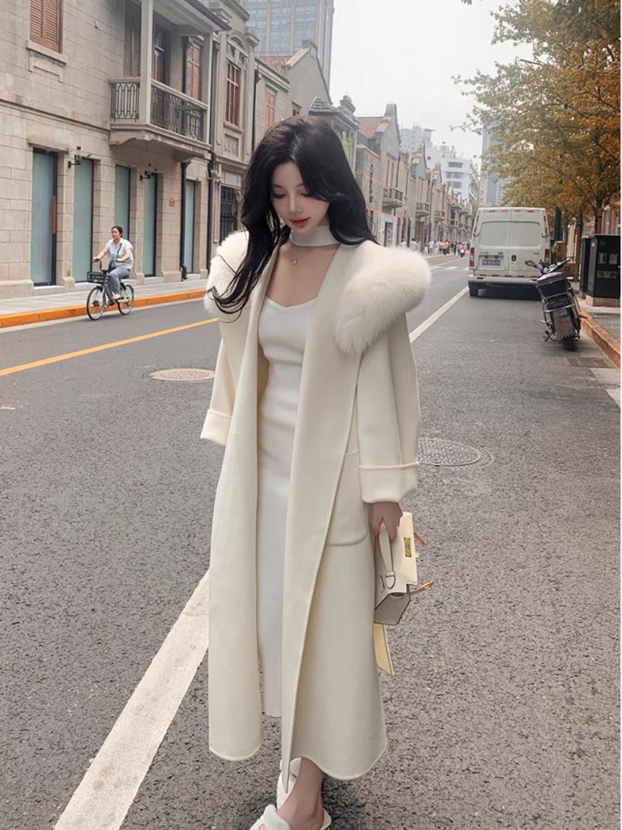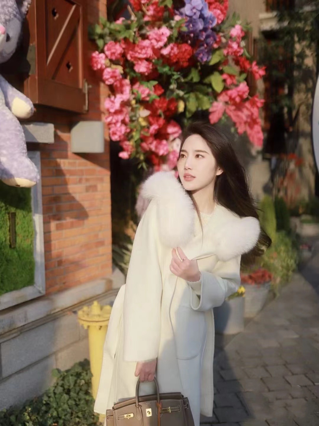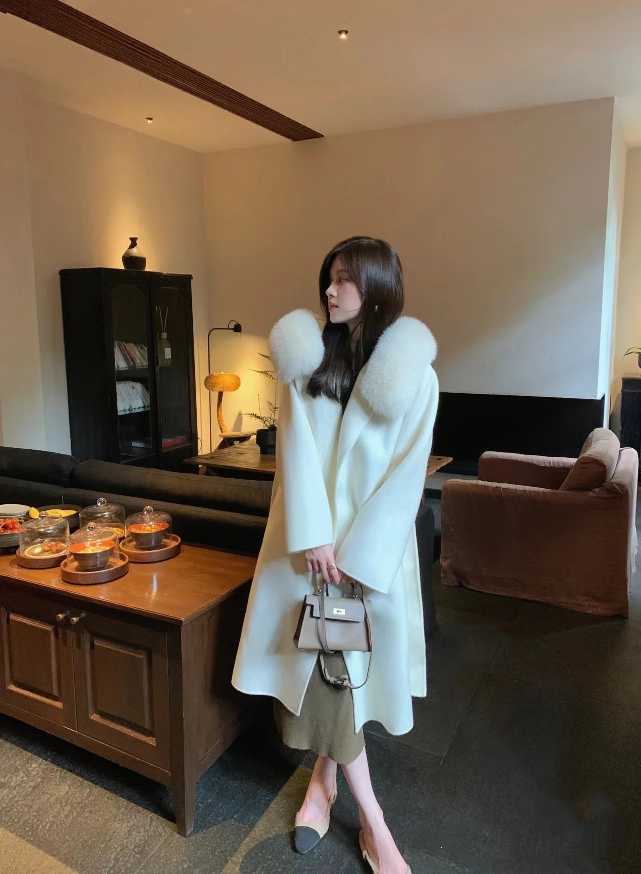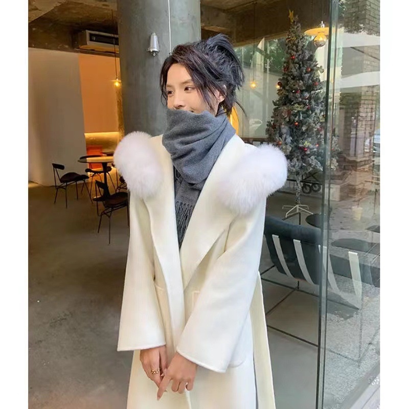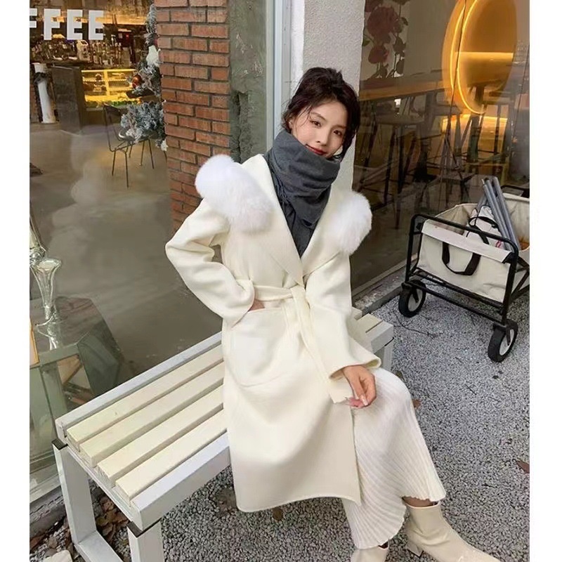 新年红色大衣狐狸毛毛领连帽羊毛大衣秋冬季加厚羊绒高级感外套女