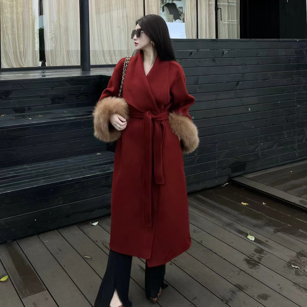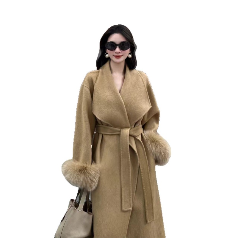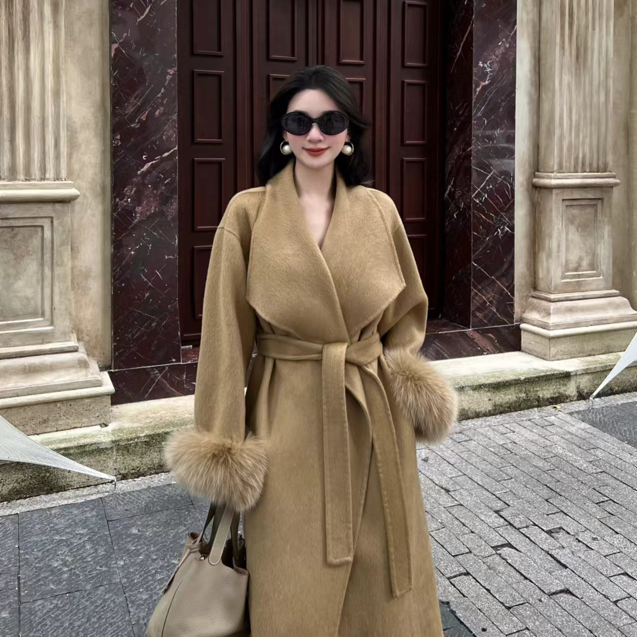 商品名称:狐狸毛领大衣斗篷系带毛呢外套女2025新款双面羊绒100羊毛名媛风