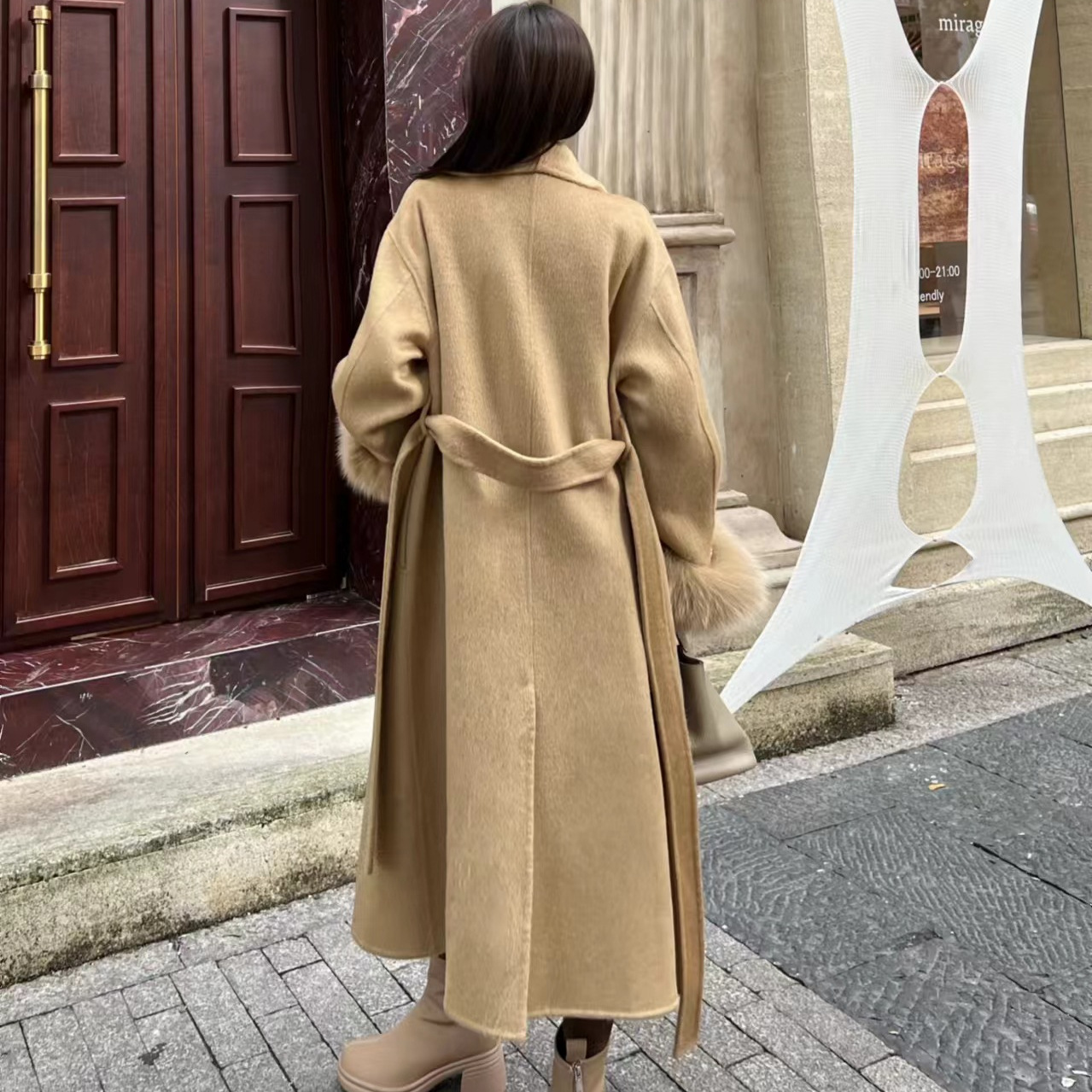 狐狸毛领大衣斗篷系带毛呢外套女2025新款双面羊绒100羊毛名媛风