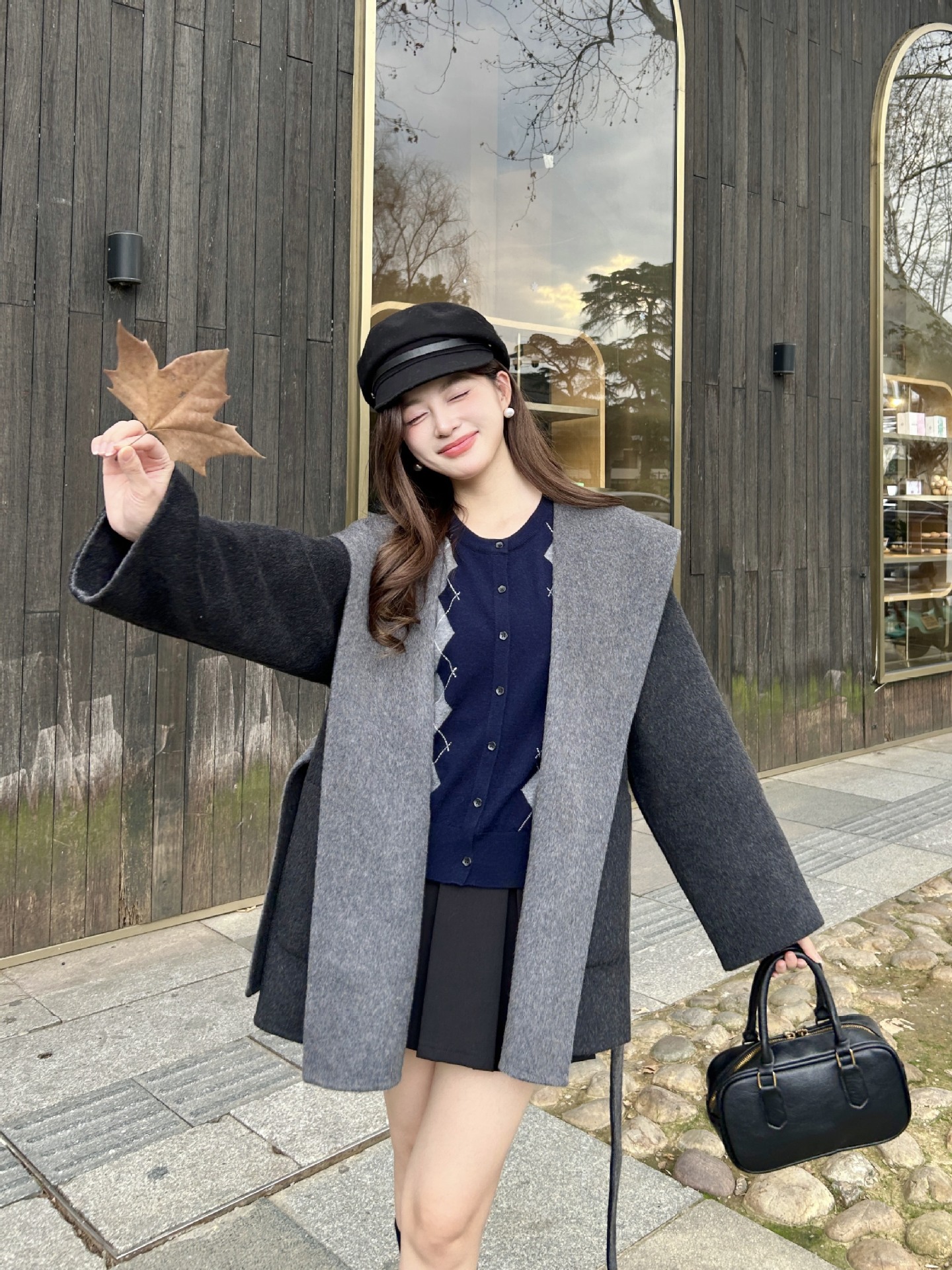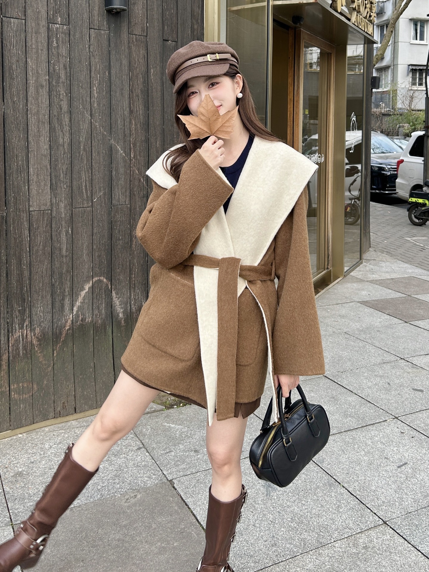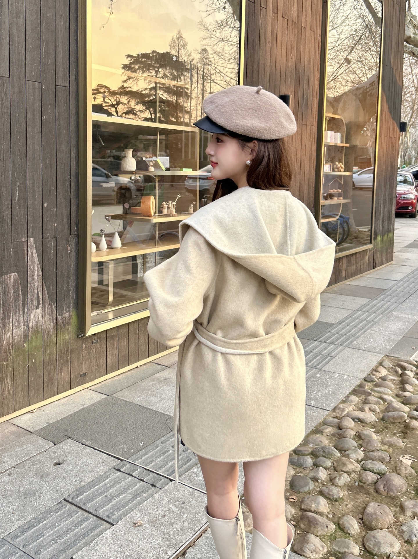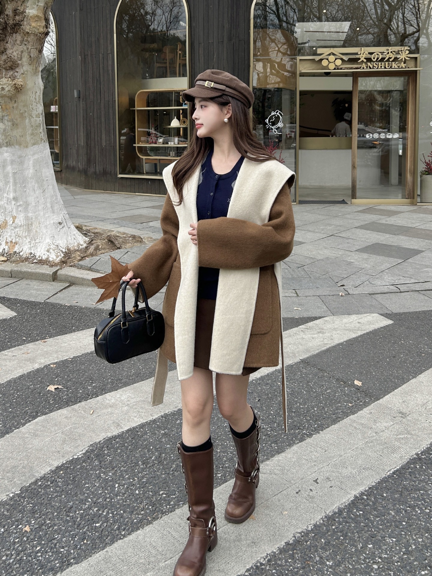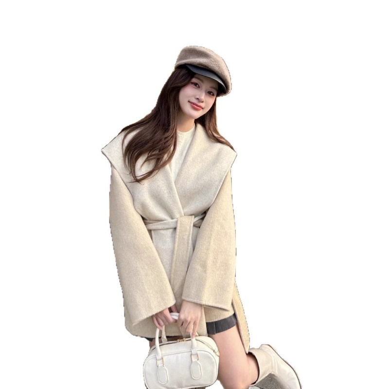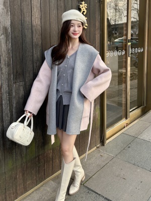 商品名称:宽松双面双色AB面设计感连帽双面羊毛大衣中长款毛呢外套女小个子