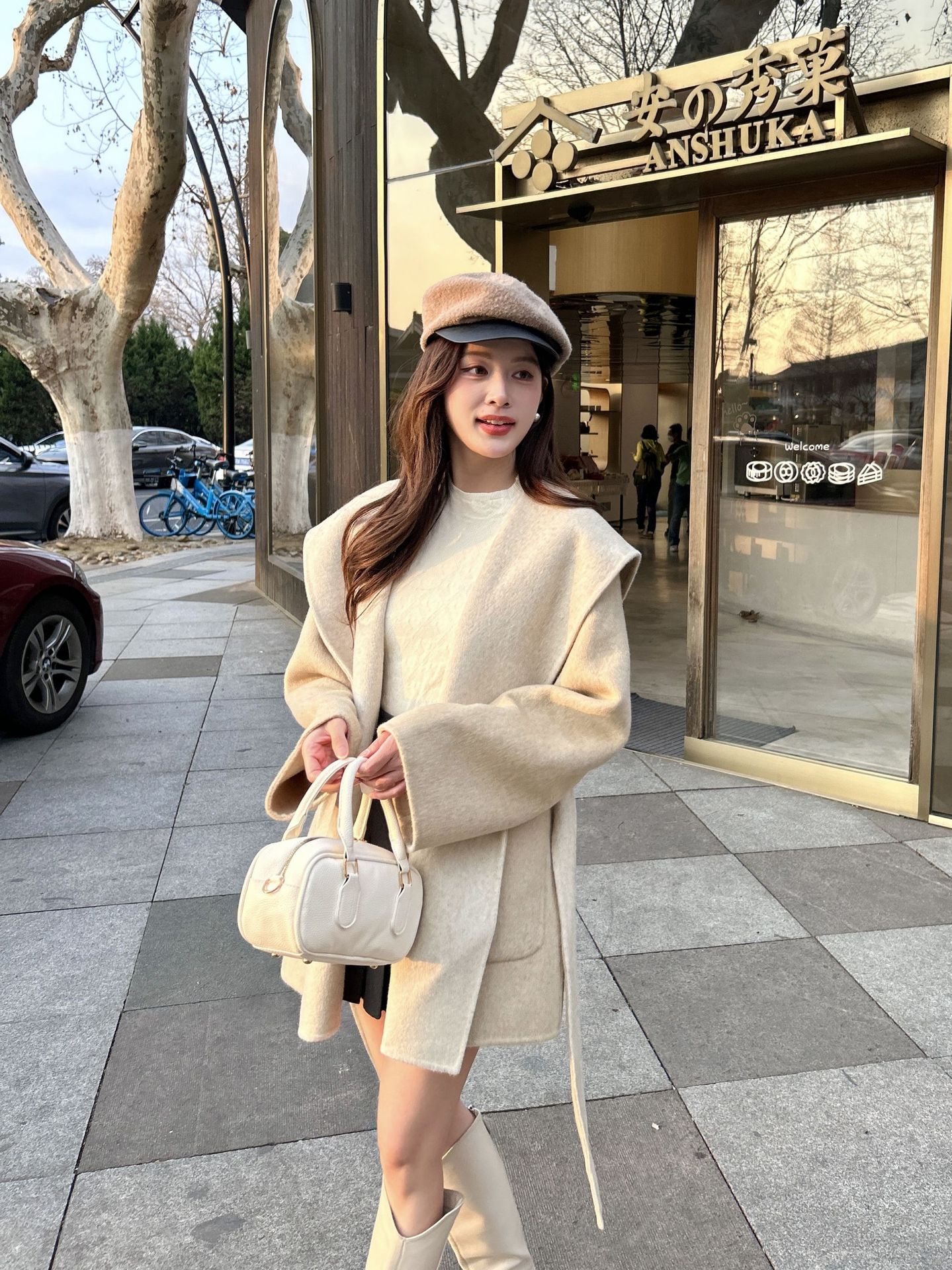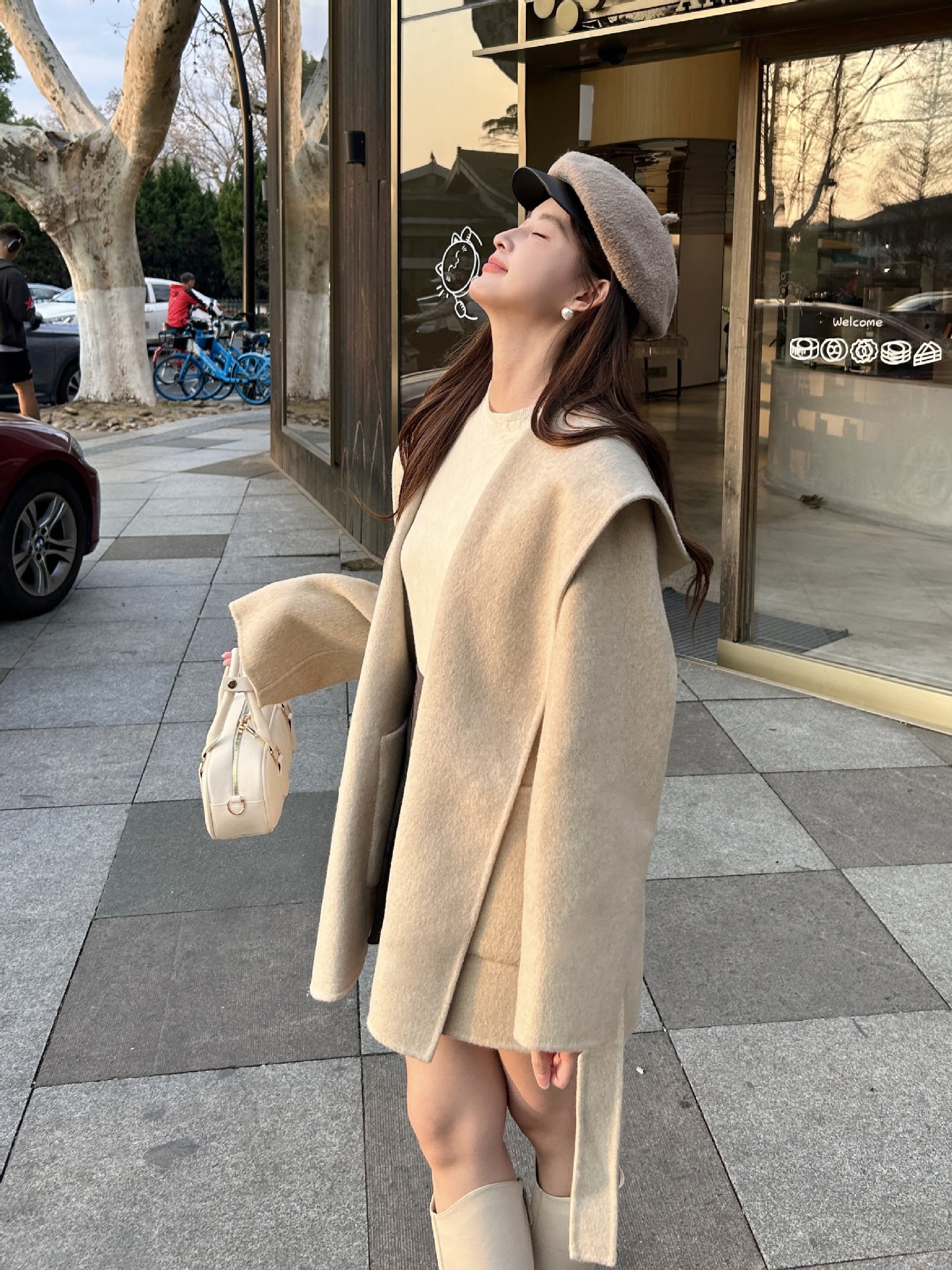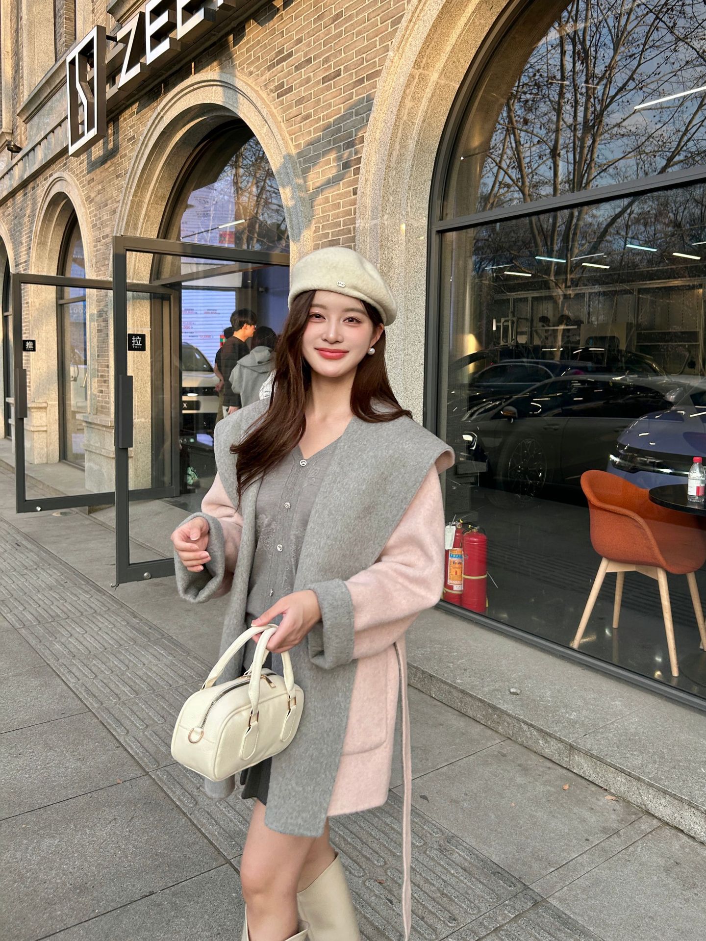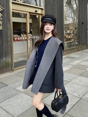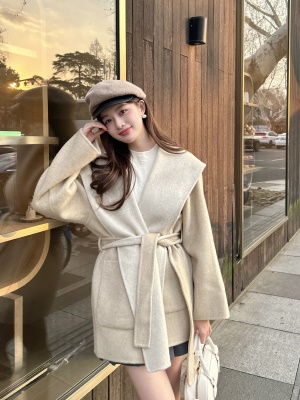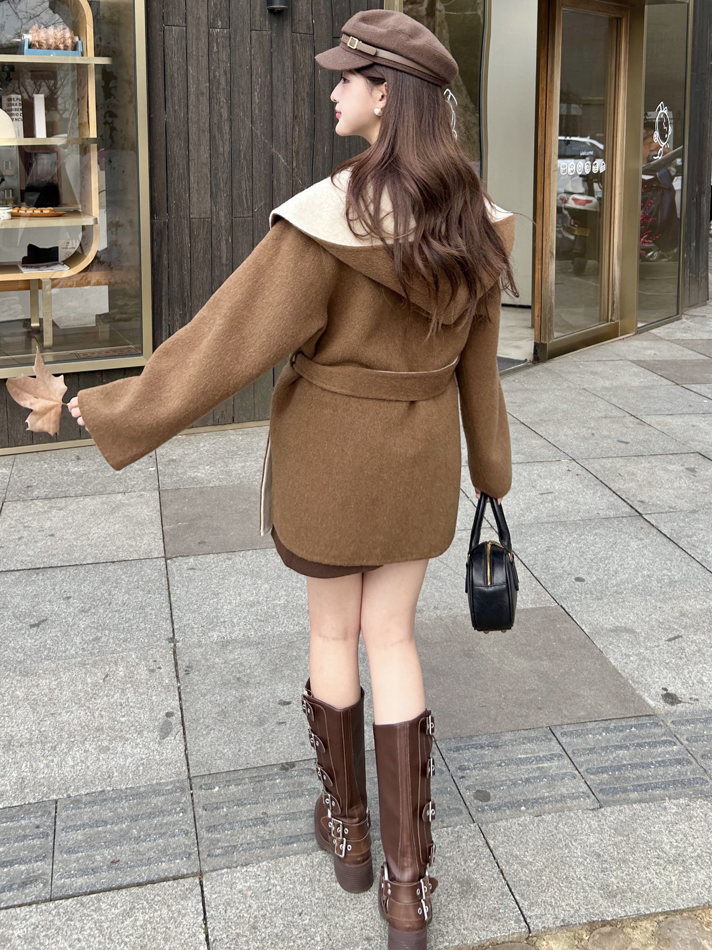 商品名称:宽松双面双色AB面设计感连帽双面羊毛大衣中长款毛呢外套女小个子
