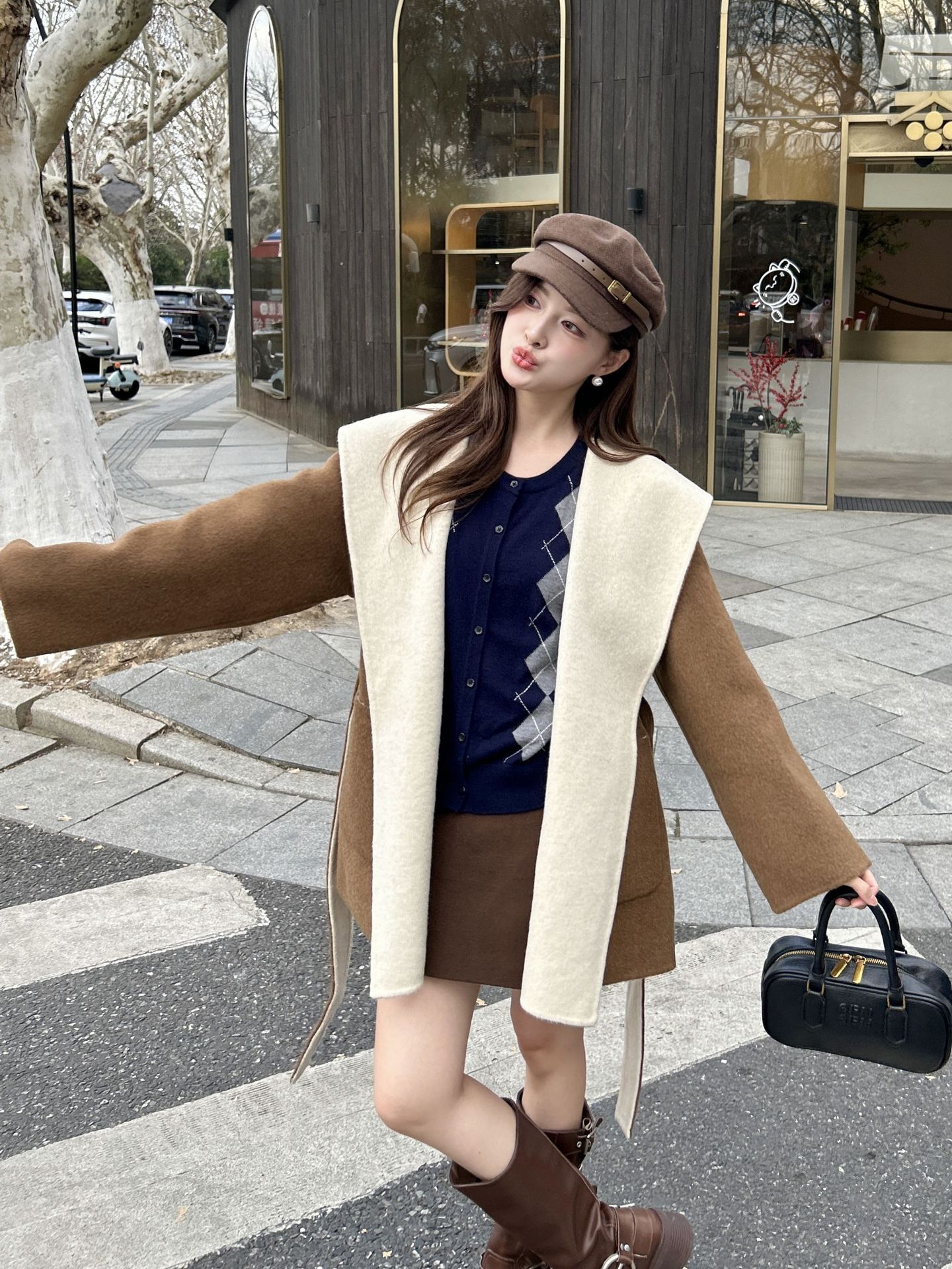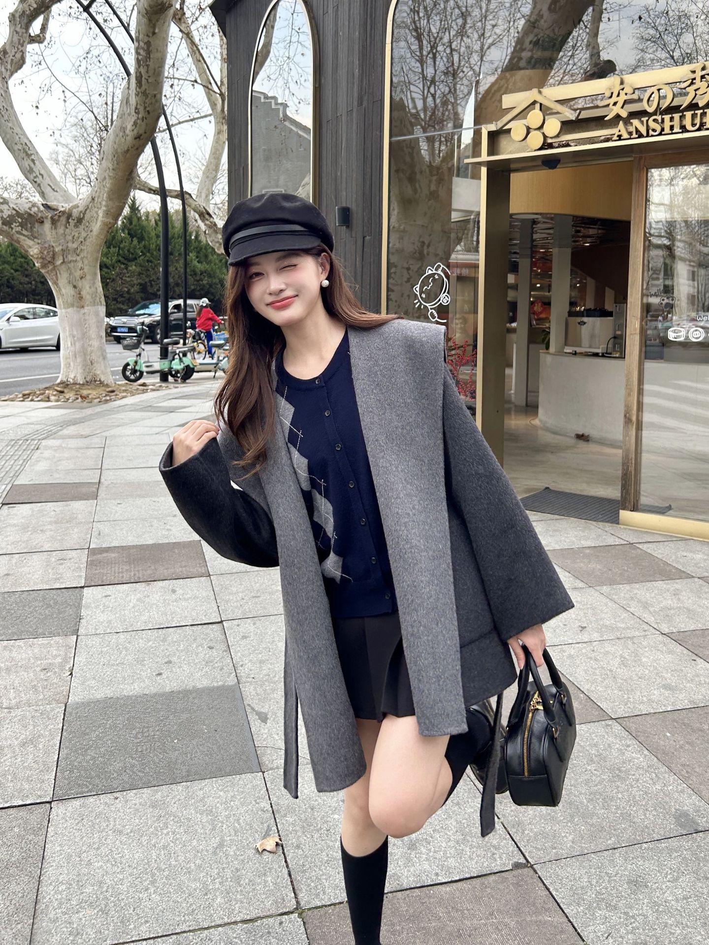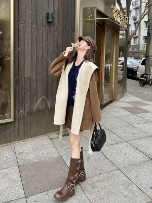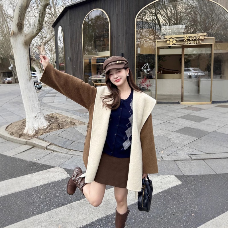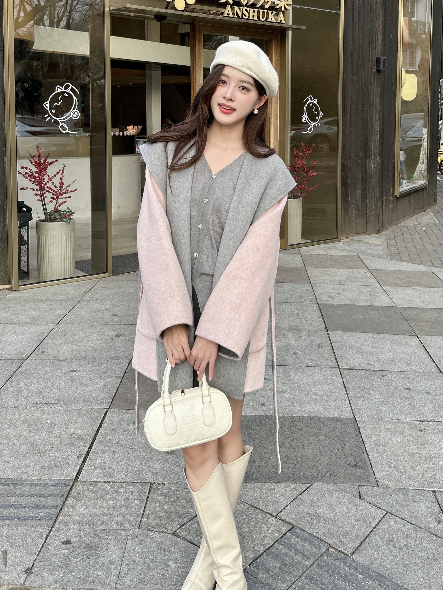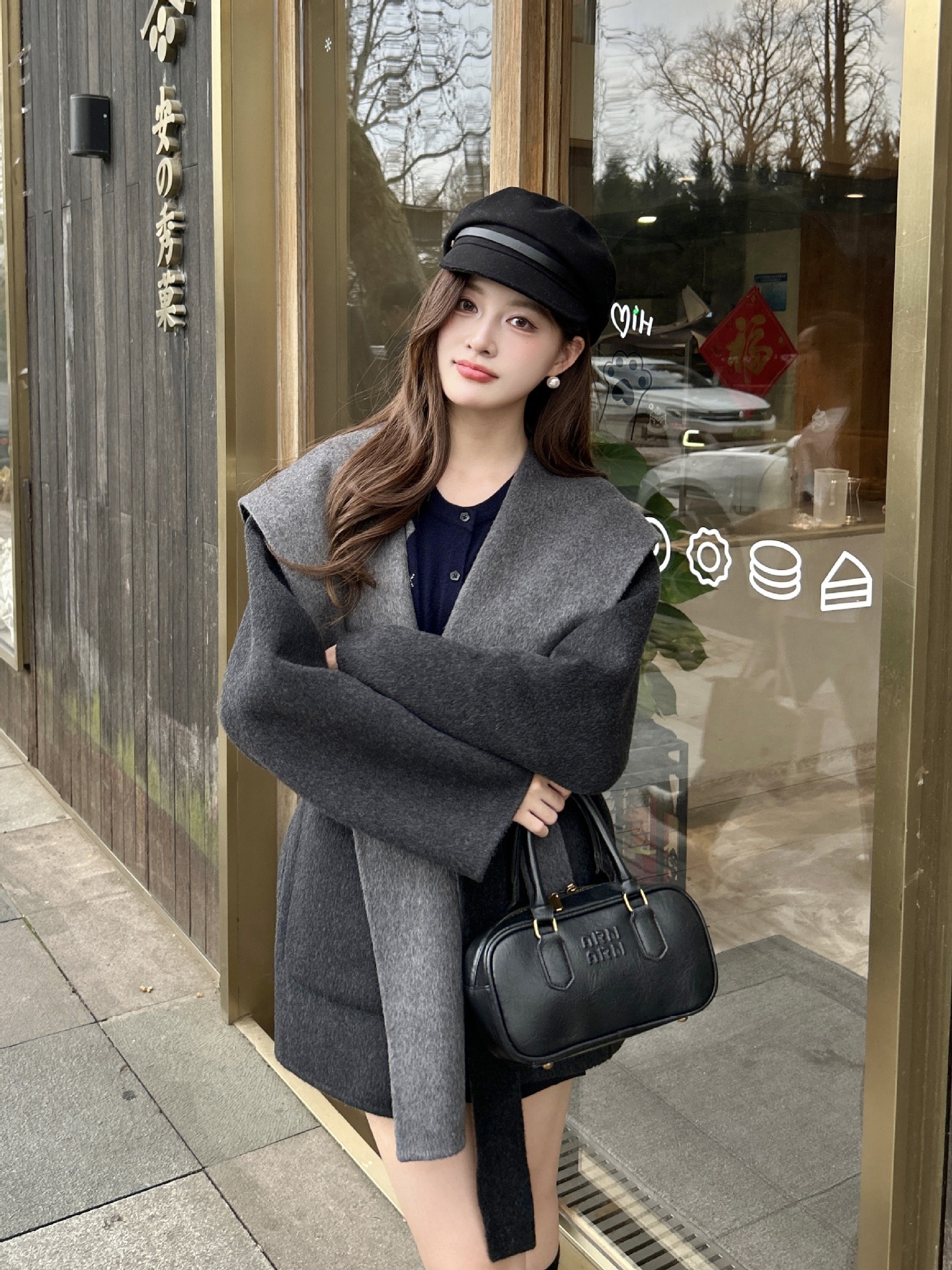 商品名称:宽松双面双色AB面设计感连帽双面羊毛大衣中长款毛呢外套女小个子