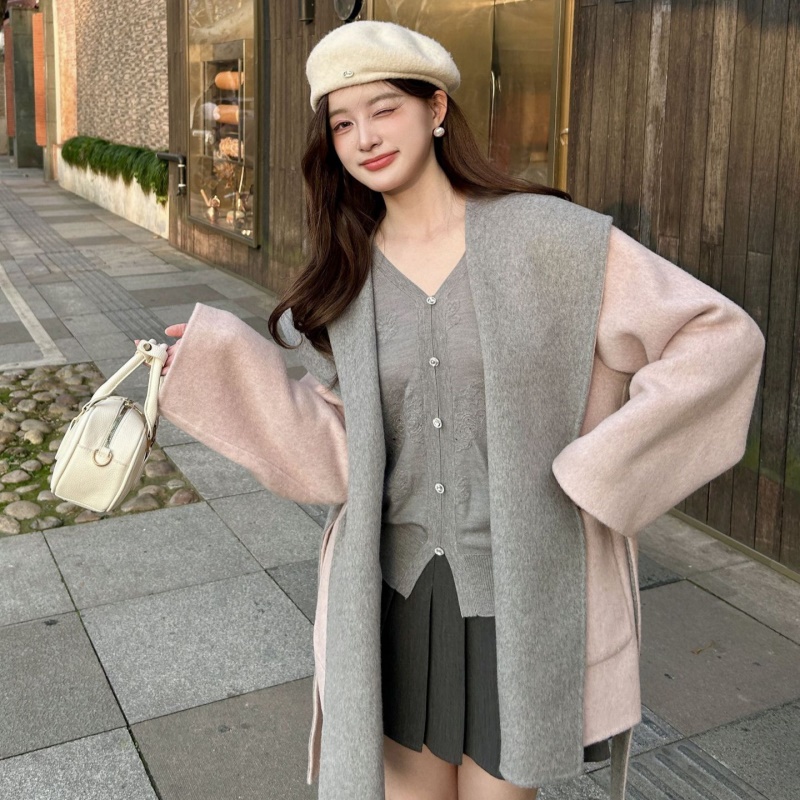 宽松双面双色AB面设计感连帽双面羊毛大衣中长款毛呢外套女小个子