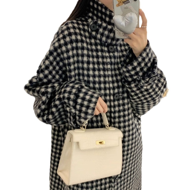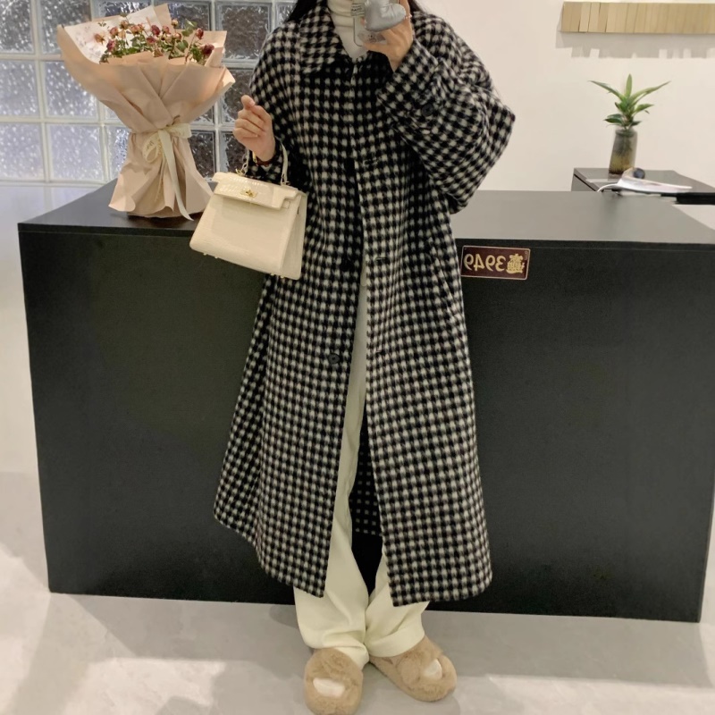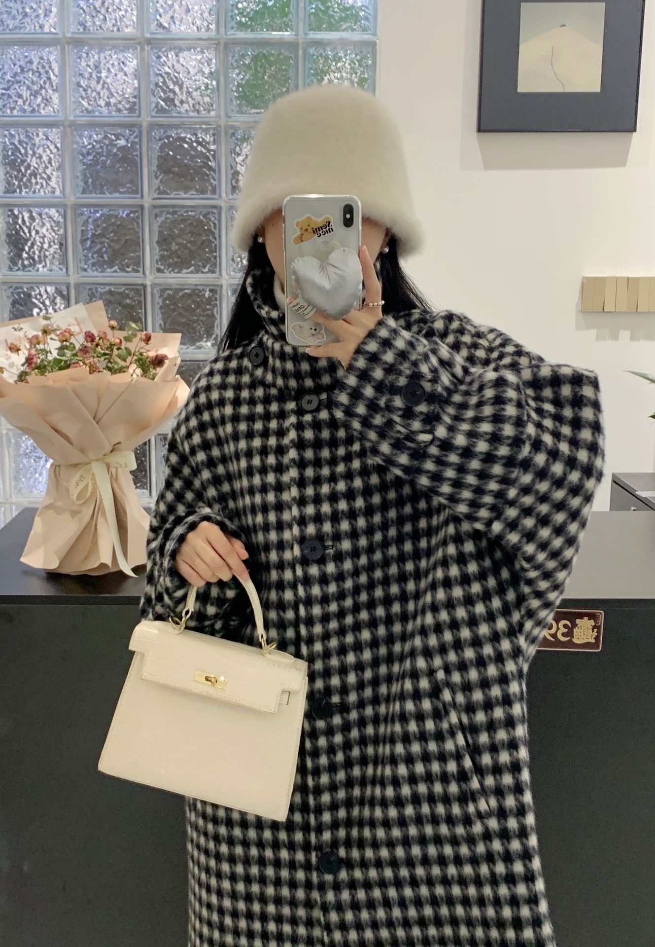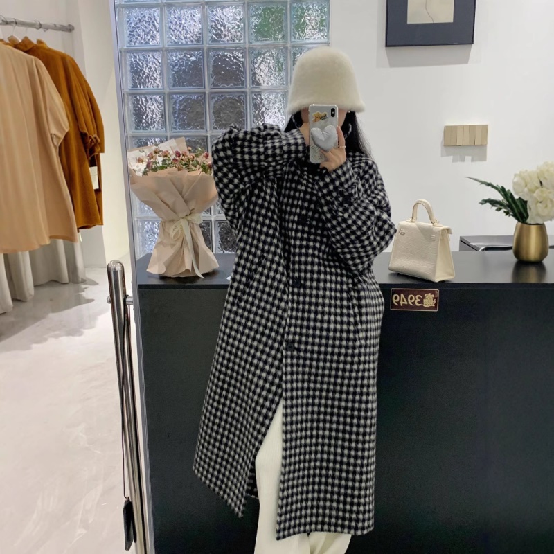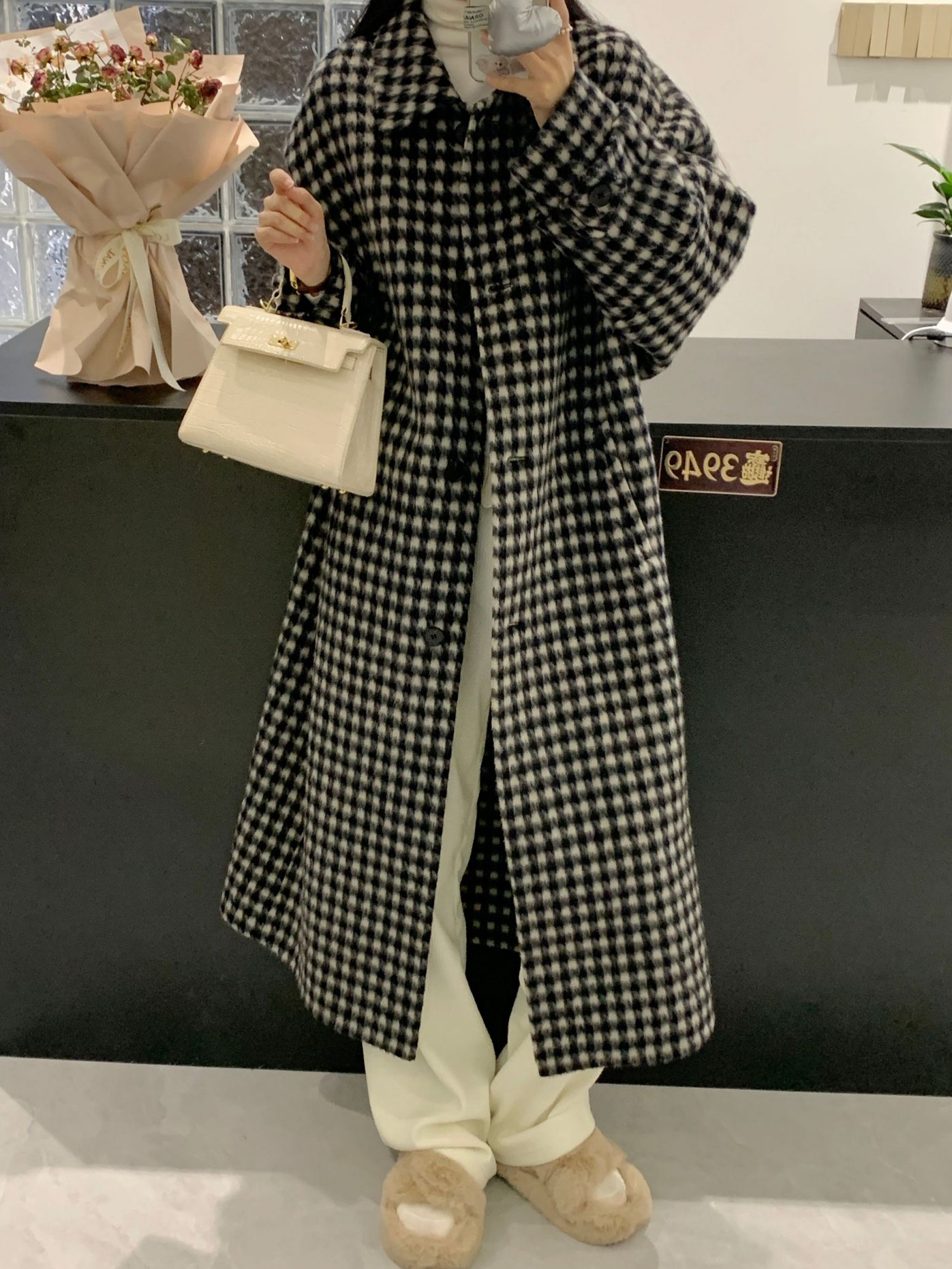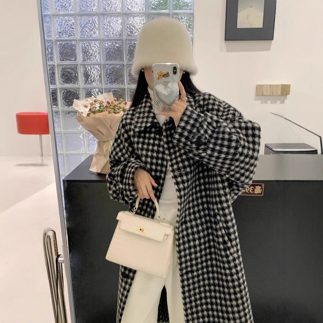 长款千鸟格羊绒大衣双面韩系气质黑白格子羊毛-9990经典简约风