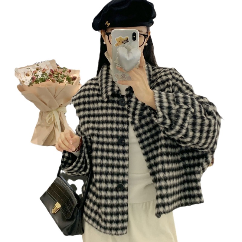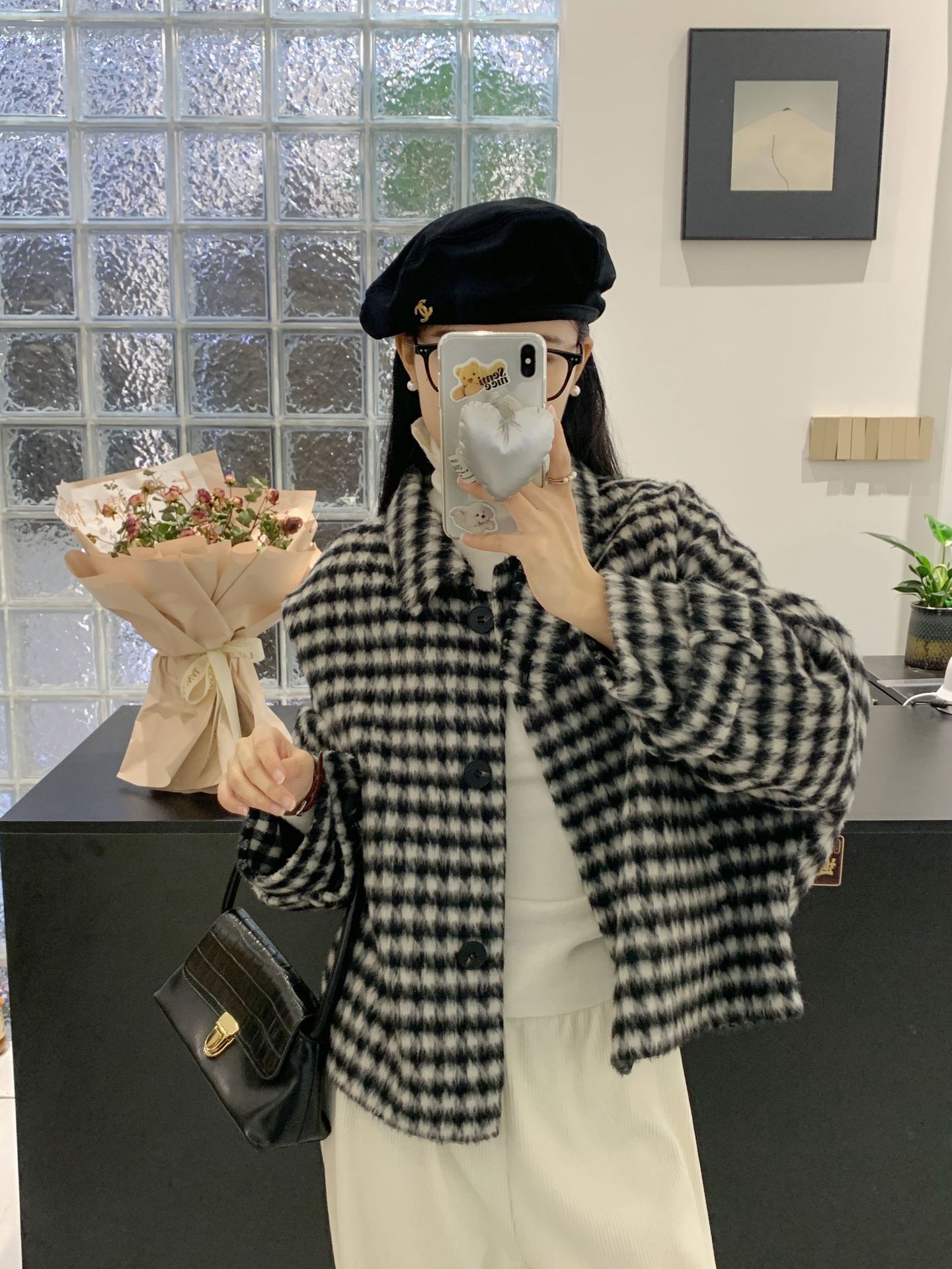 商品名称:千鸟格毛呢外套女2024秋冬新款小个子韩版宽松减龄呢大衣时尚百搭