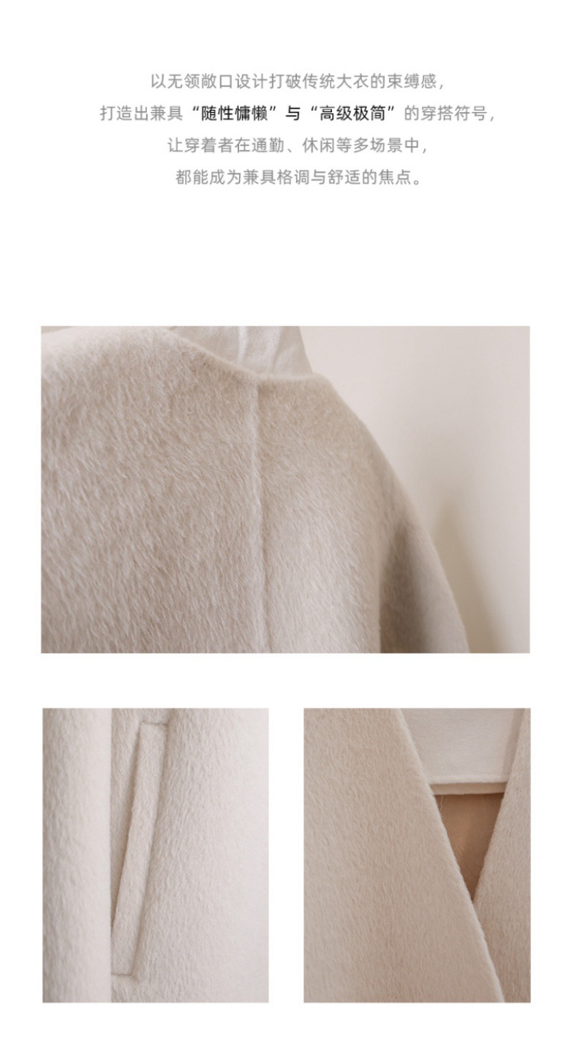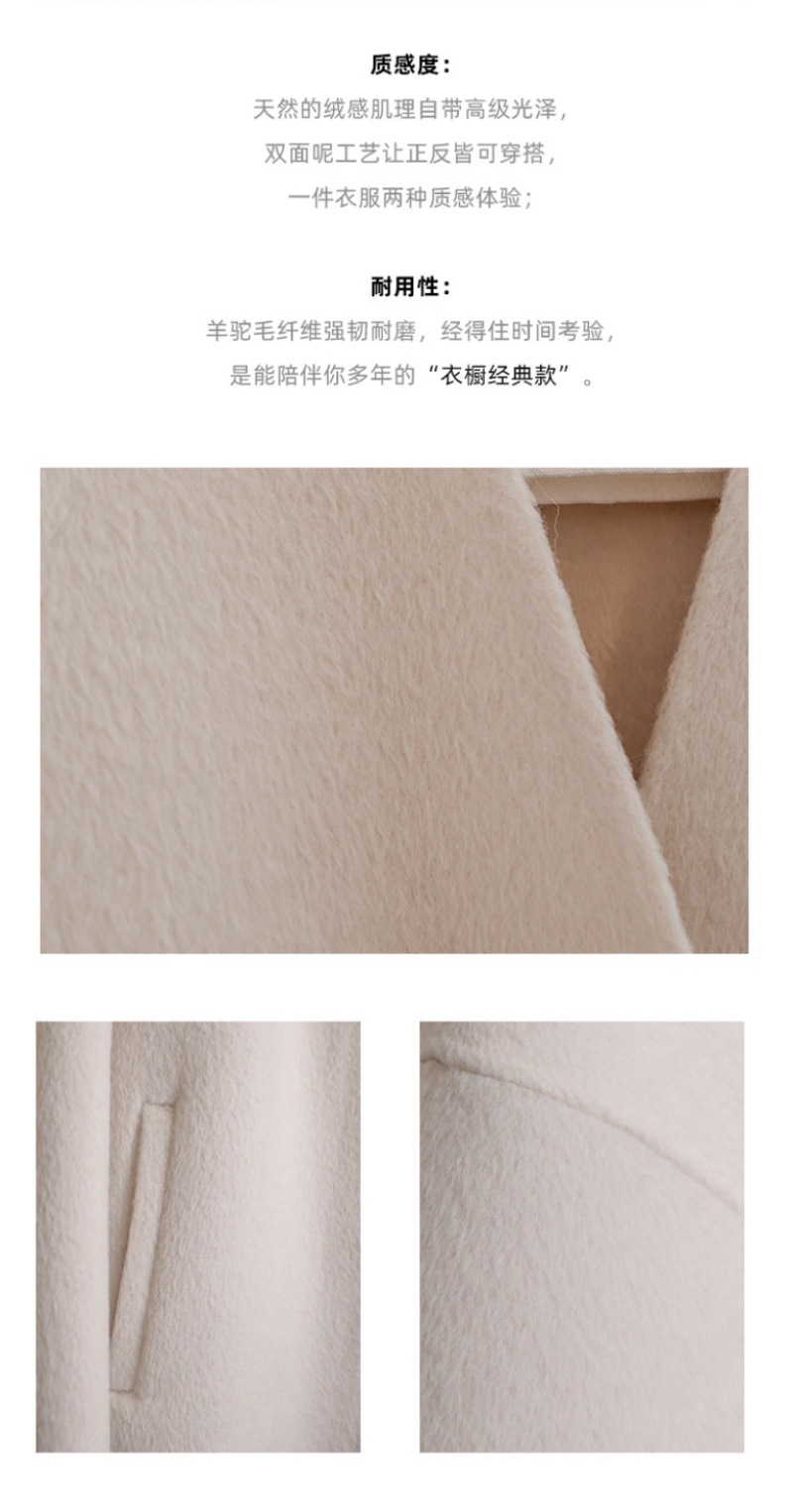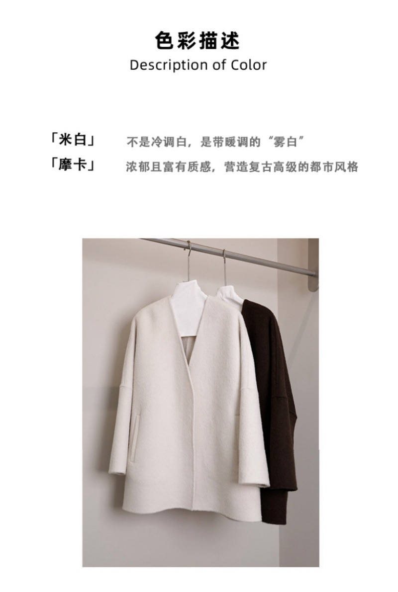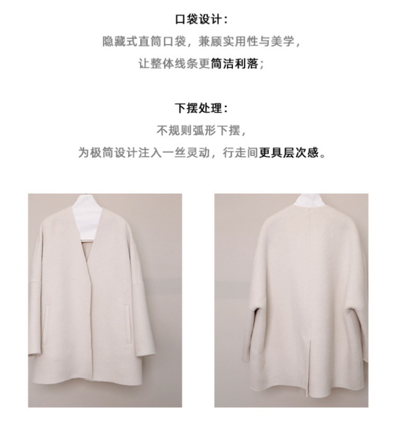商品名称:英皇贝贝黄金品类高档奢级气质现代极简V领拼袖高档羊驼毛双面呢
