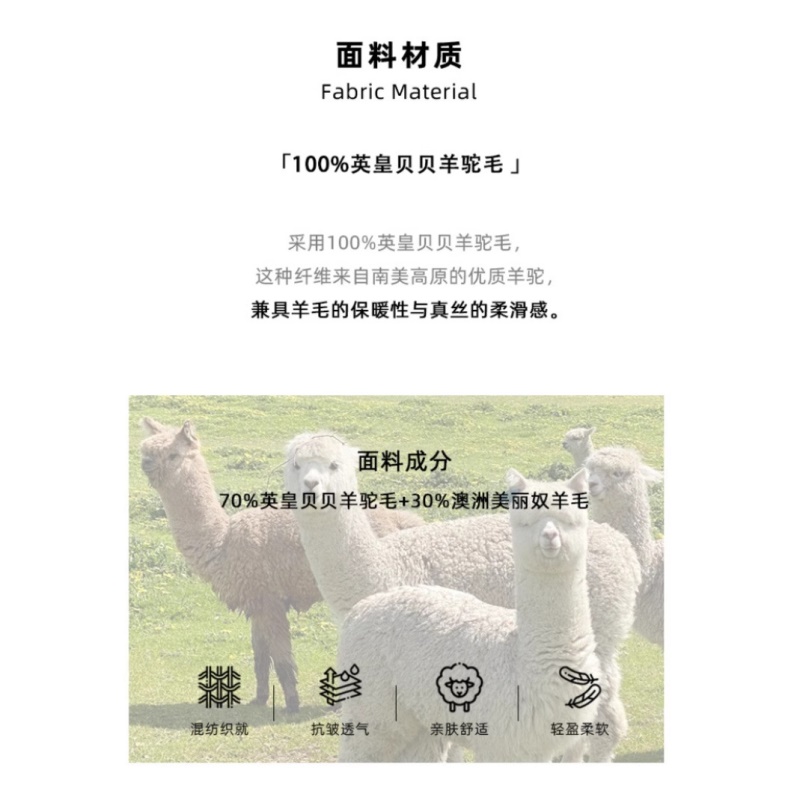 t因此,当您购买一件由18.5微米羊驼毛制成的产品时,您购买的不仅仅是一种材料,更是一份源于安第斯山脉的、极其稀有且珍贵的自然资源。也是您价值的体现。
