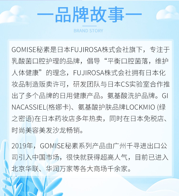 GOMISE秘素是专注于乳酸菌口腔护理的品牌,它倡导“平衡口腔菌落,维护人体健康”的理念。目前在全国等各大商场畅销热卖。