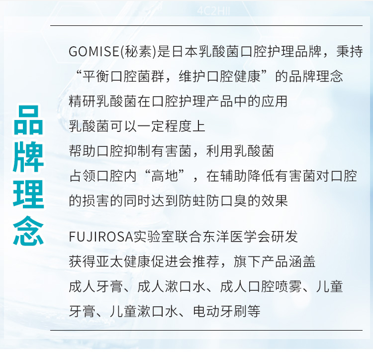 【GOMISE秘素】是日本专注于乳酸菌口腔护理的品牌,它倡导“平衡口腔菌落,维护人体健康”理念。产品在全国各大商场畅销。