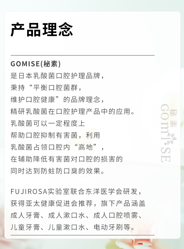 【GOMISE秘素】是日本专注于乳酸菌口腔护理的品牌,它倡导“平衡口腔菌落,维护人体健康”理念。产品在全国各大商场畅销。