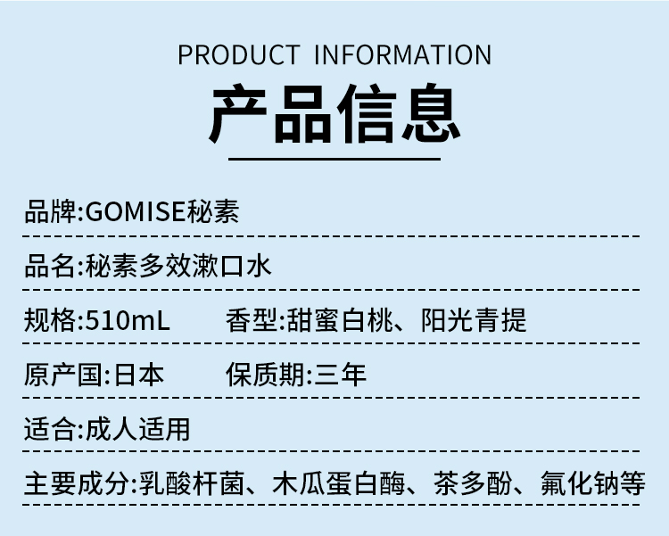 【GOMISE秘素】是日本专注于乳酸菌口腔护理的品牌,它倡导“平衡口腔菌落,维护人体健康”理念。产品在全国各大商场畅销。