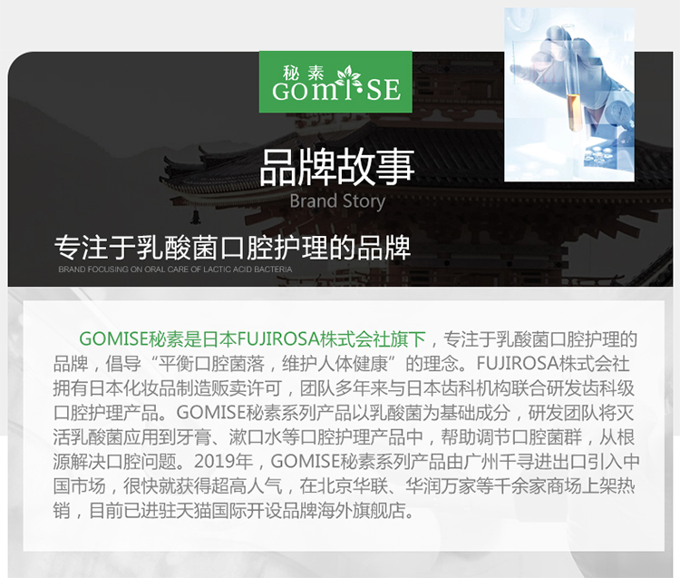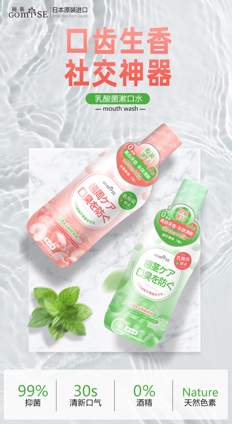 【GOMISE秘素】是日本专注于乳酸菌口腔护理的品牌,它倡导“平衡口腔菌落,维护人体健康”理念。产品在全国各大商场畅销。